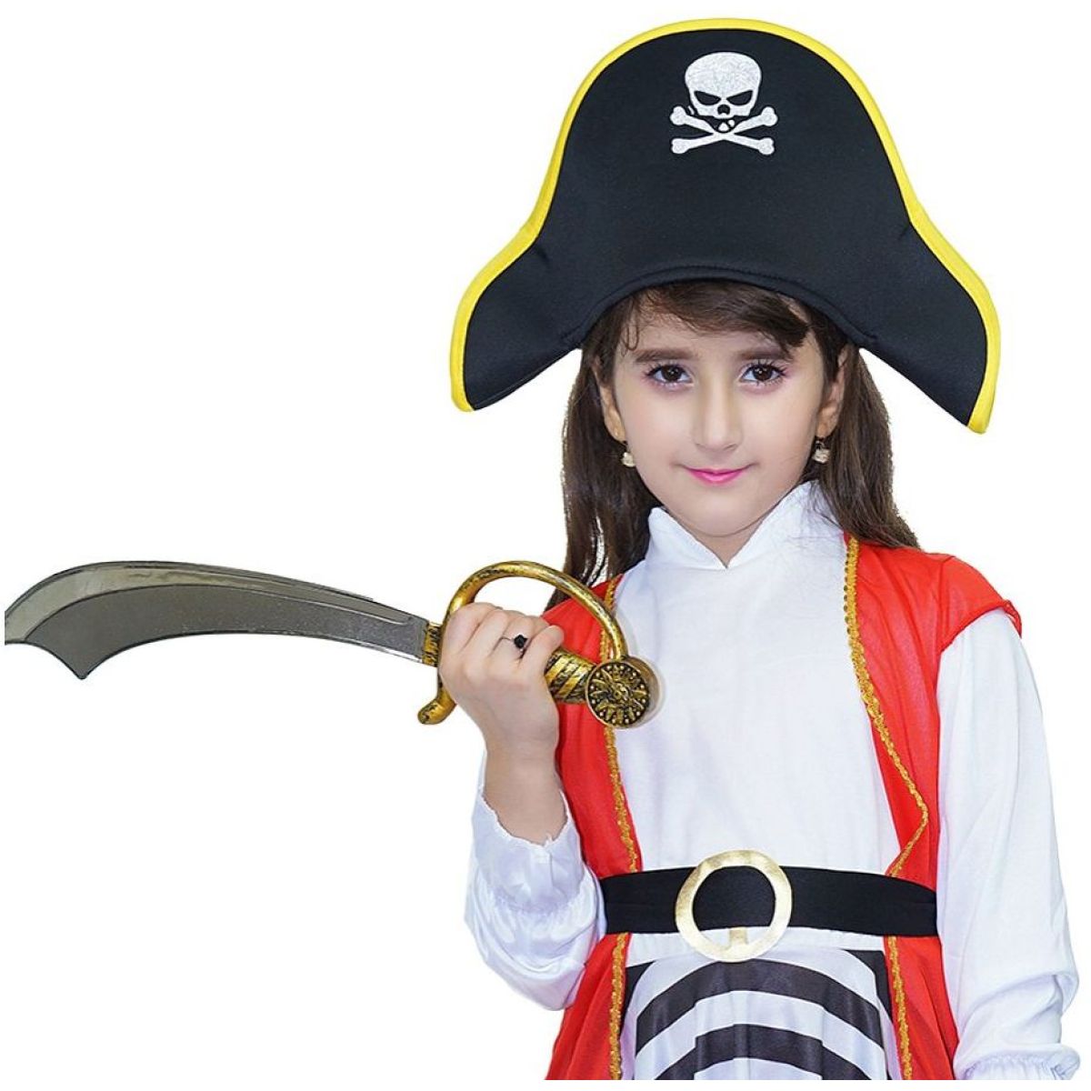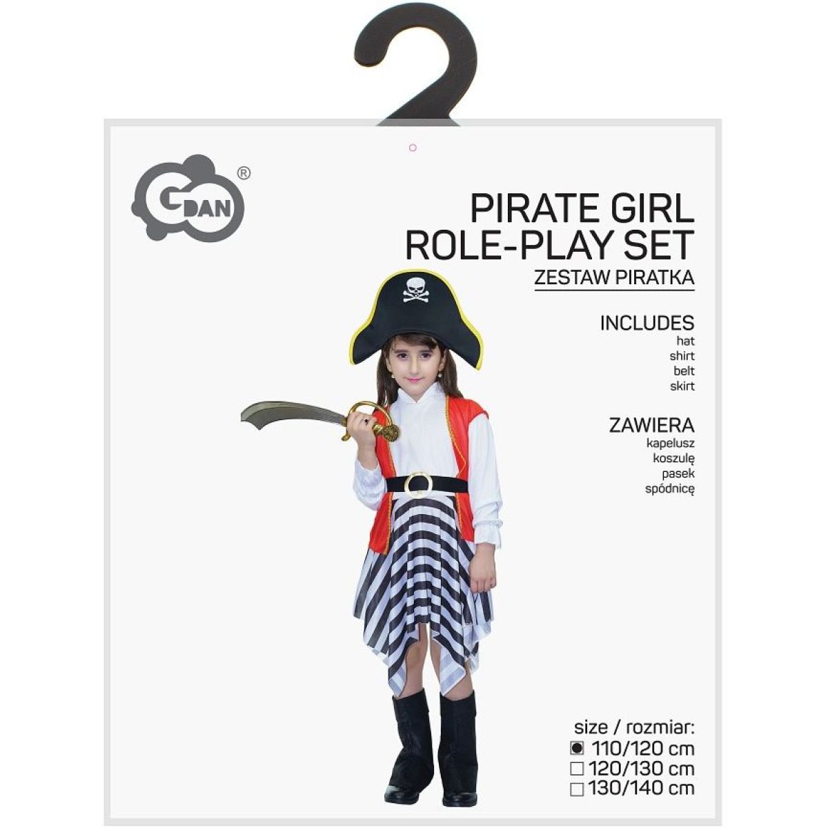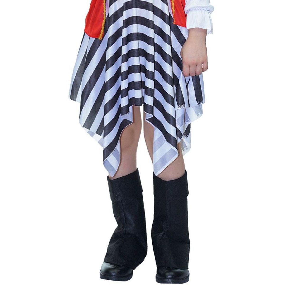 Sada obsahuje stylový pirátský klobouk s motivem lebky, bílou halenku s volánky, červenou vestu se zlatým lemem, výraznou pruhovanou sukni, pásek s velkou přezkou a návleky na boty, které dodávají kostýmu autentický vzhled. Lehký materiál a pohodlný střih umožňují dětem volný pohyb a maximální komfort po celou dobu nošení. Kostým je určen dětem od 3 let a podporuje kreativitu i fantazii při hře.