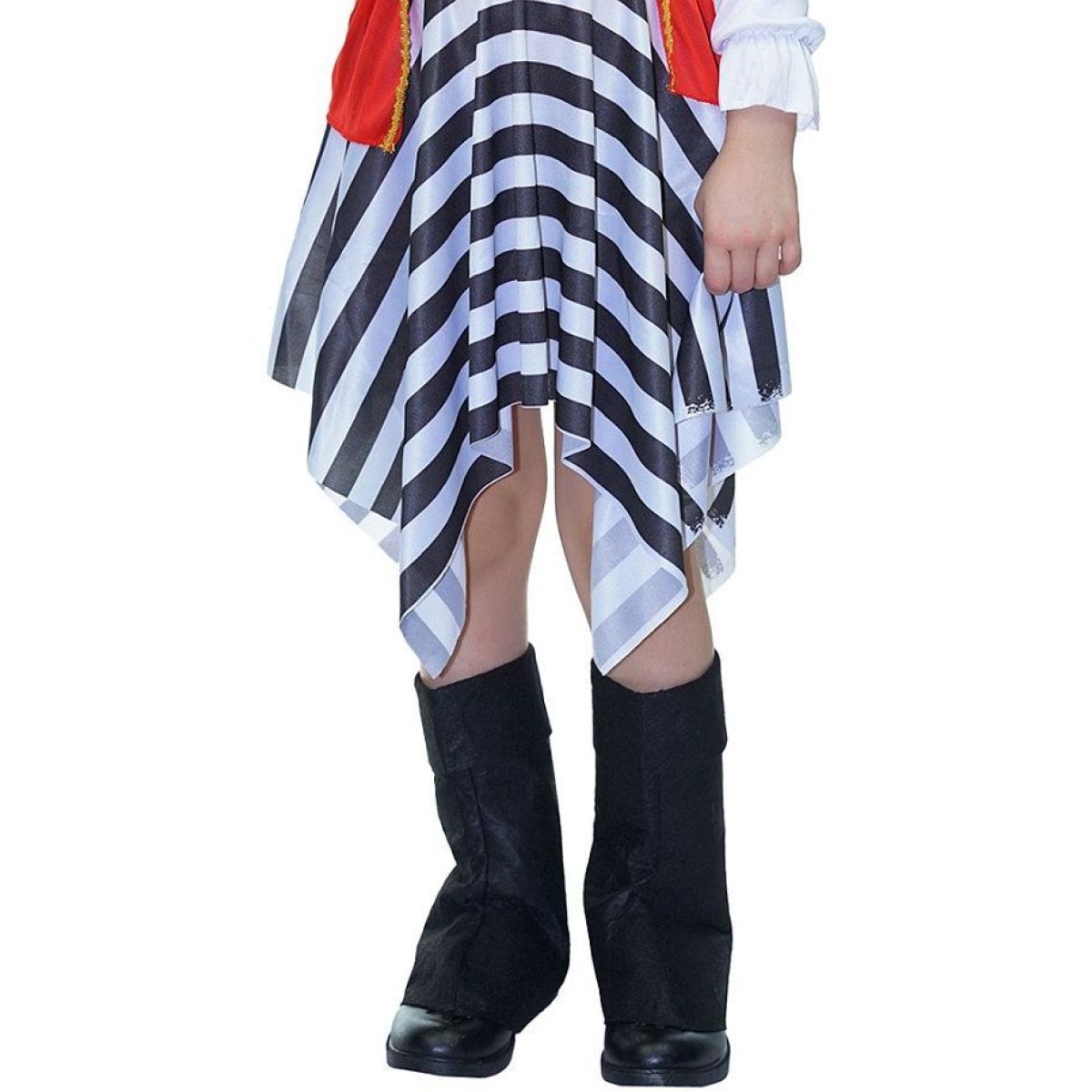 Dominantním doplňkem je černý pirátský klobouk se žlutým lemováním a ikonickou lebkou s hnáty. Celkový vzhled doplňují černé návleky na boty, které imitují vysoké pirátské kozačky. Kostým je pohodlný, lehký a připravený na každé pirátské dobrodružství.
