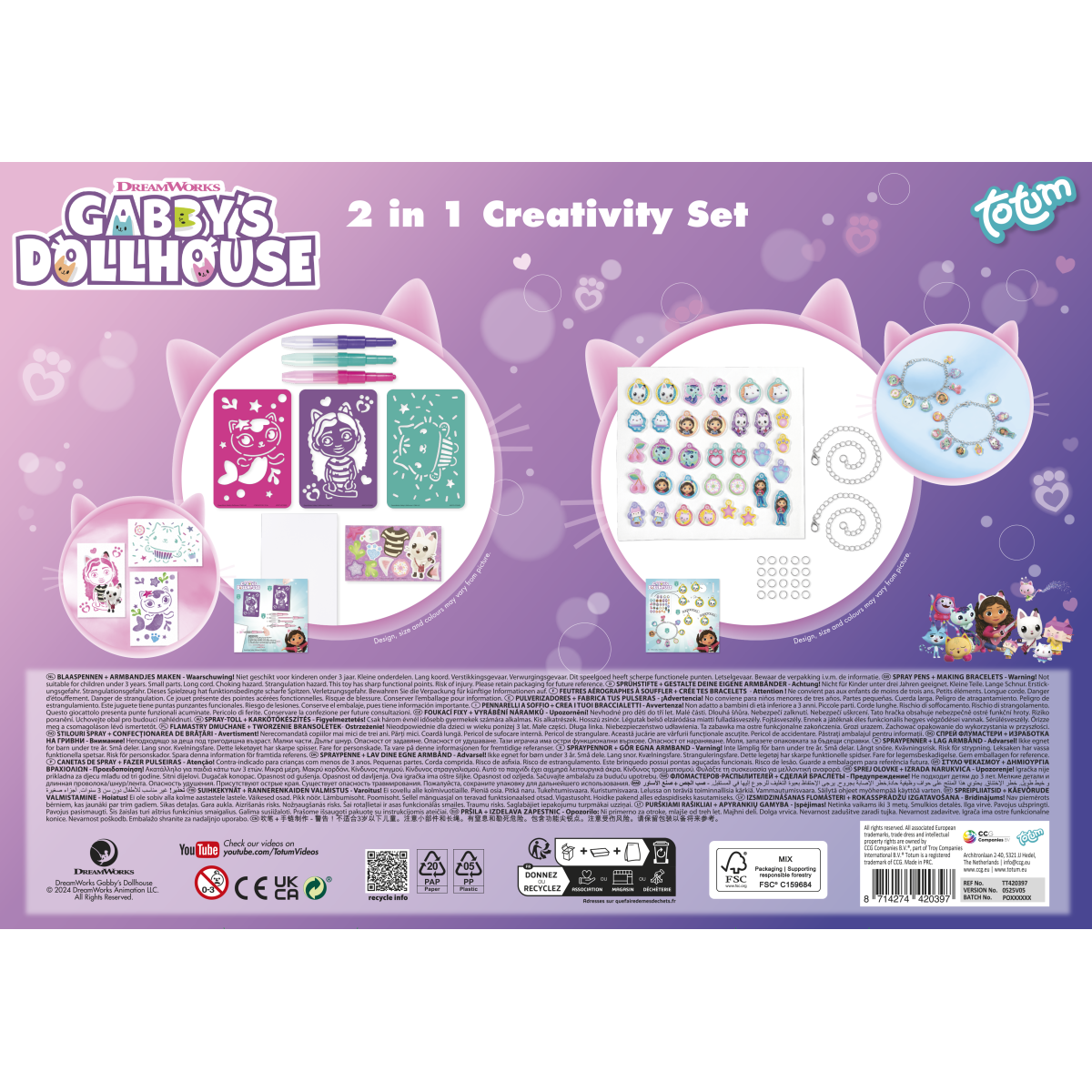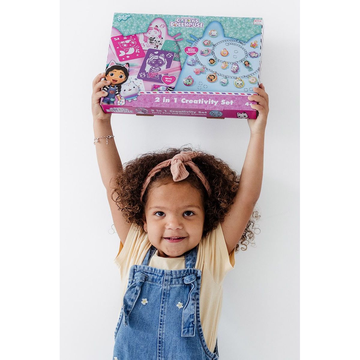 Kreativní sada 2v1 Gábinčin kouzelný domek otevírá dveře do světa fantazie a tvoření. Nejprve mohou malé umělkyně pomocí sprejovacích per a šablon vytvářet kouzelné obrázky plné barev, a poté si navrhnout vlastní stylové náramky s roztomilými přívěsky.