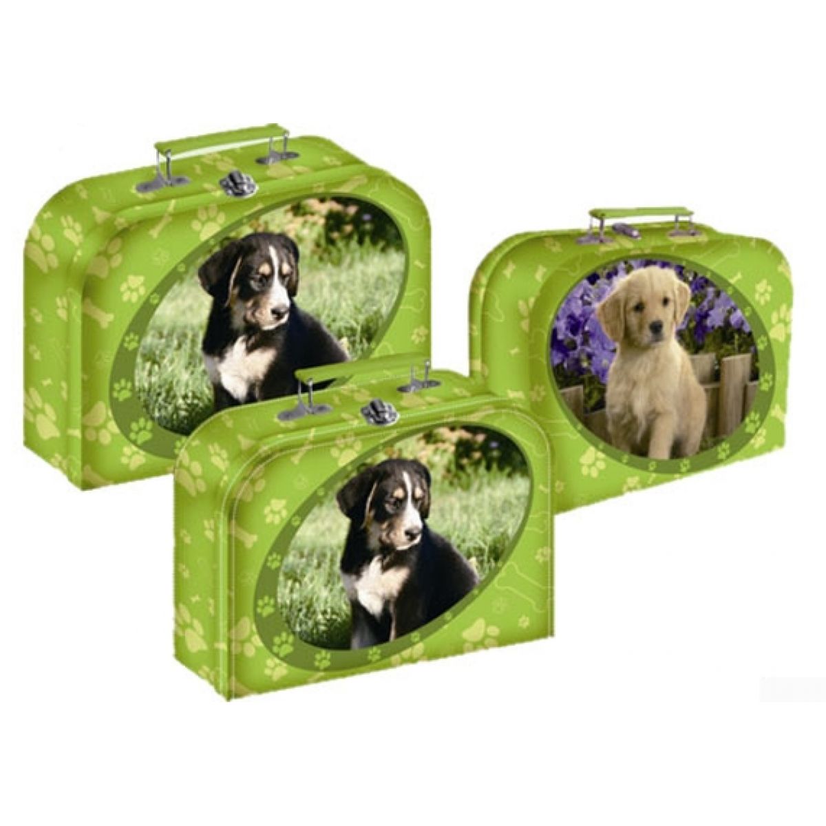 Malý dětský kufřík z tvrdého papíru s motivem štěňátek. Součástí je praktické kovové madlo a patent na uzavření.
