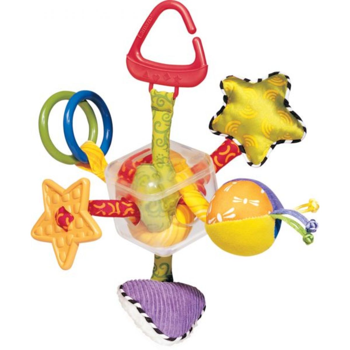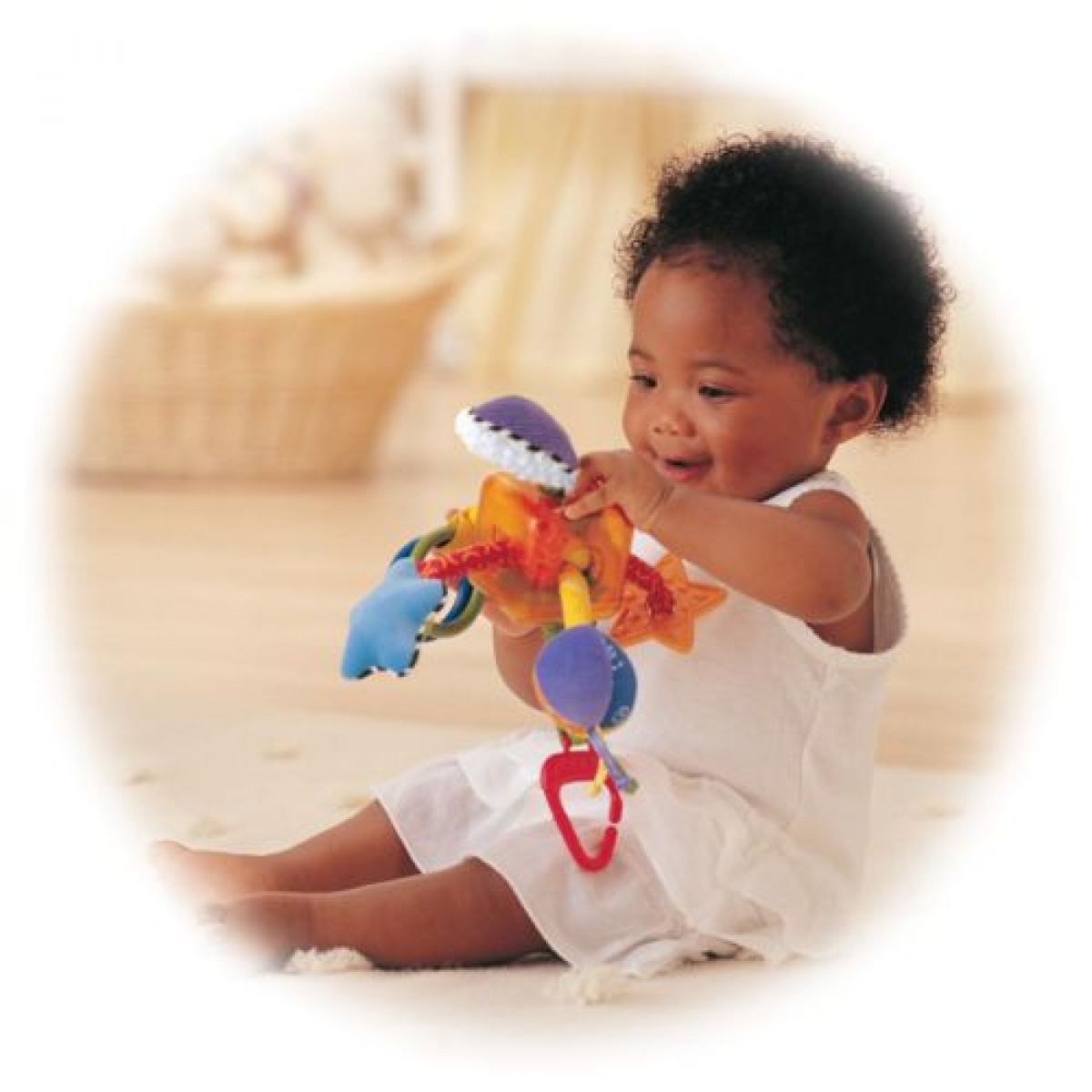 Chrastítko se šesti různými předměty na každém konci provázku vydávají různé zvuky a tóny, dítě může držet, okusovat nebo tahat. Podporuje rozvoj koordinace pohybů rukou, jemnou motoriku dětských prstů a obouruční hru. Vyrobeno z různých pestrobarevných materiálů. Provázky se sbíhají uprostřed do uzlu, který je schovaný v průhledném plastovém krytu.