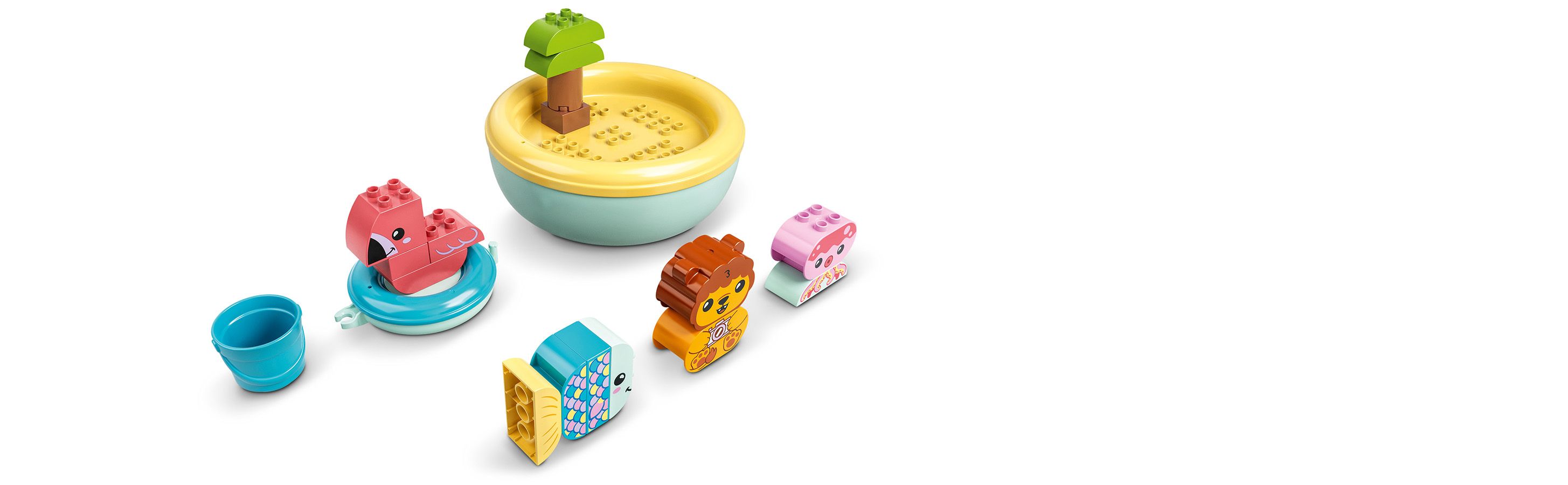 Čtyři zvířátka si mohou děti sestavit vždy ze dvou dílků a následně si s nimi hrát ve vodě s plovoucím ostrovem, sestavitelným také ze dvou dílků. V sadě děti naleznou také plovoucí kruh a kyblík. Kyblíkem mohou polévat zvířátka, a strom, jenž roste na ostrově