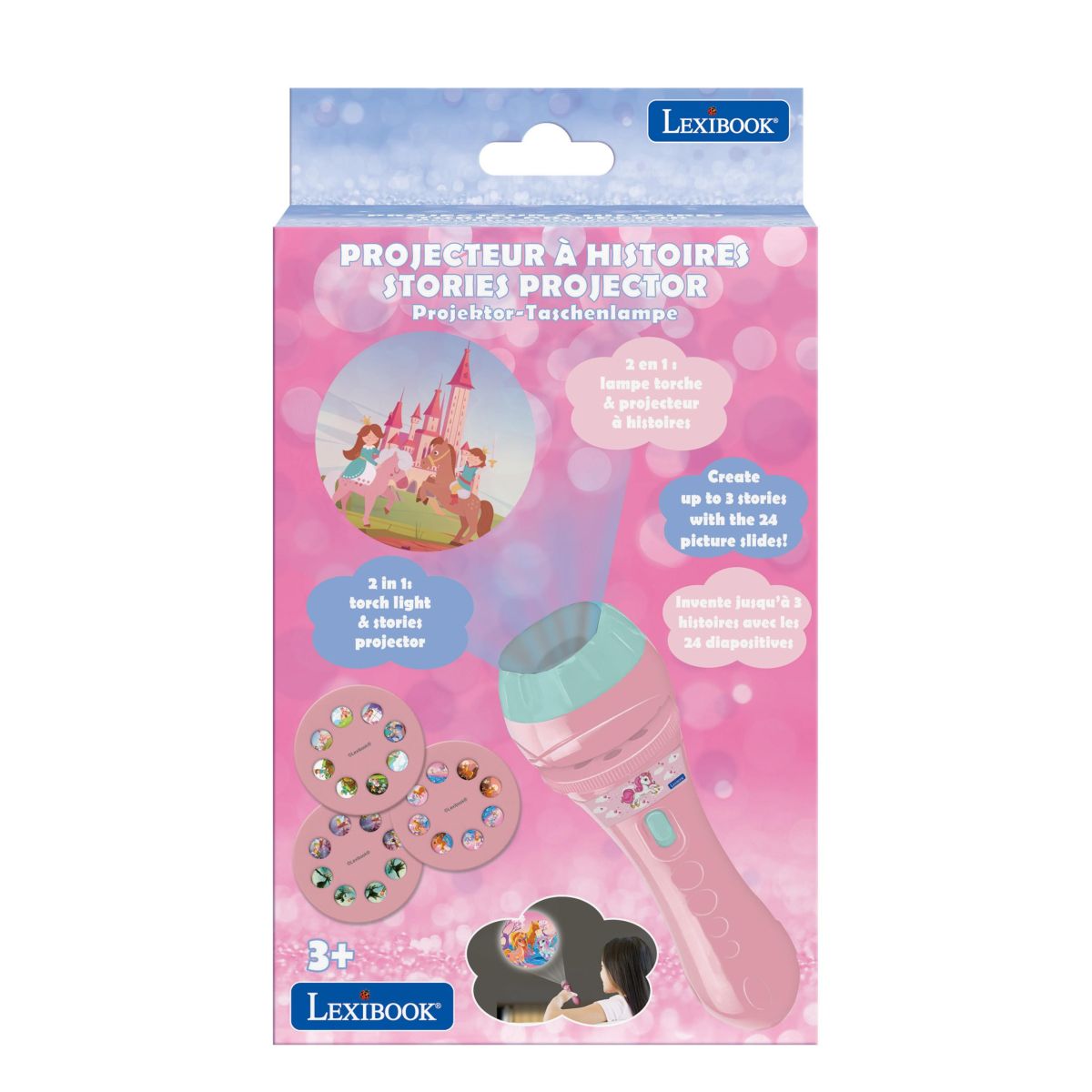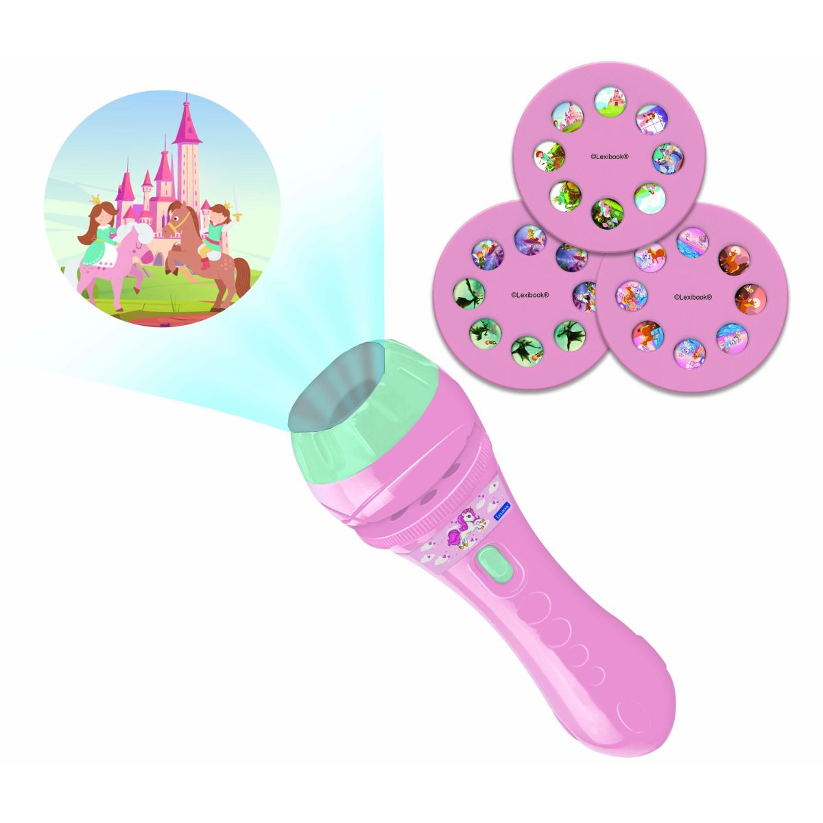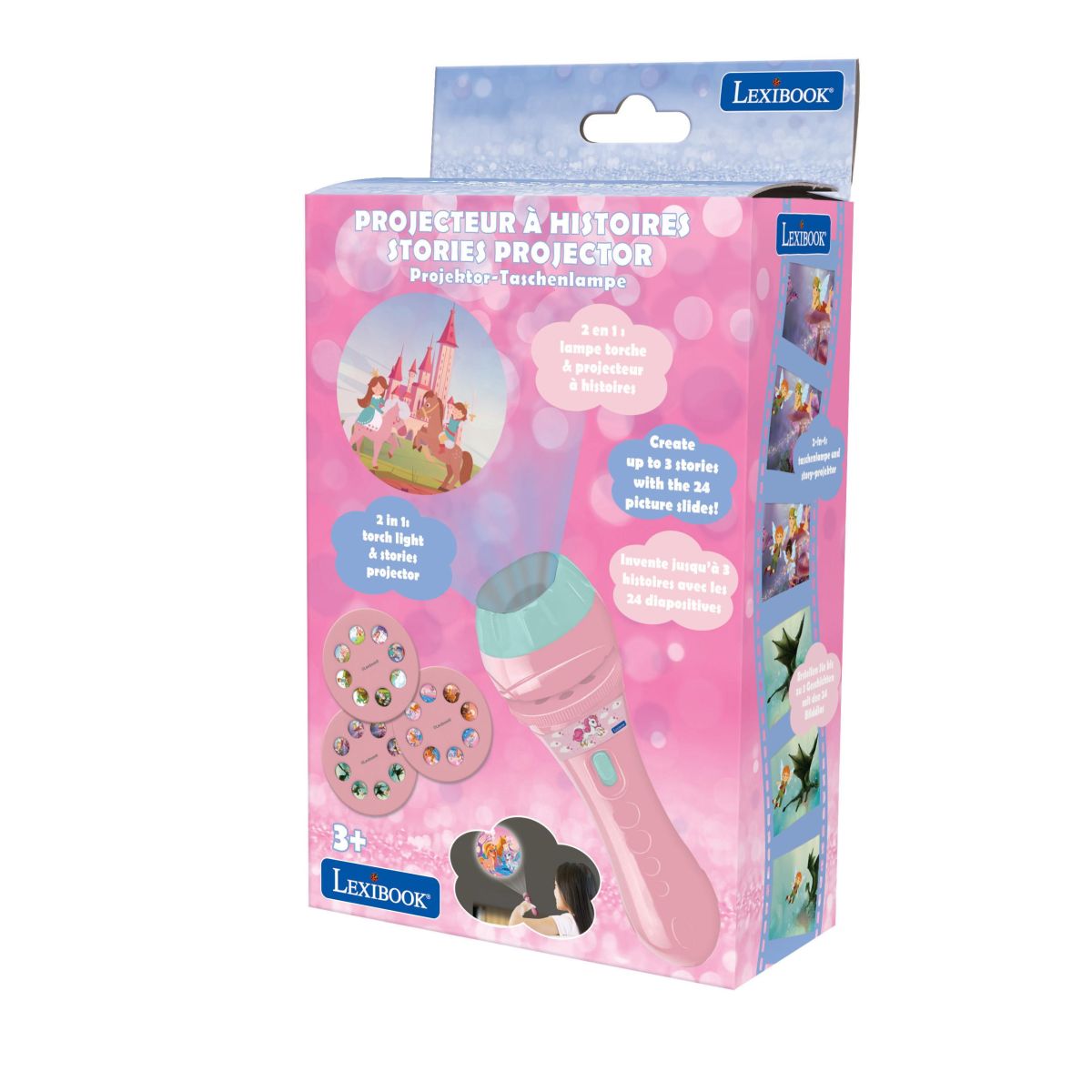 Stačí vložit jeden ze tří projekčních kotoučů a na stěně nebo stropě se objeví barevné scény s jednorožci, vílami a dalšími pohádkovými postavami. Celkem 24 obrázků nabízí prostor pro vlastní příběhy a rozvíjí dětskou představivost i slovní zásobu.