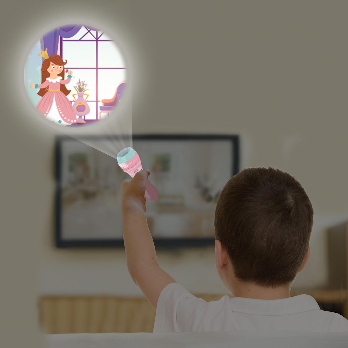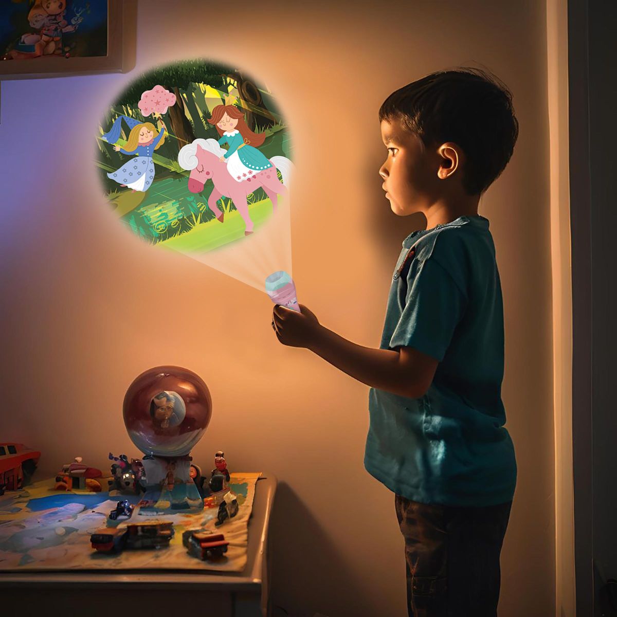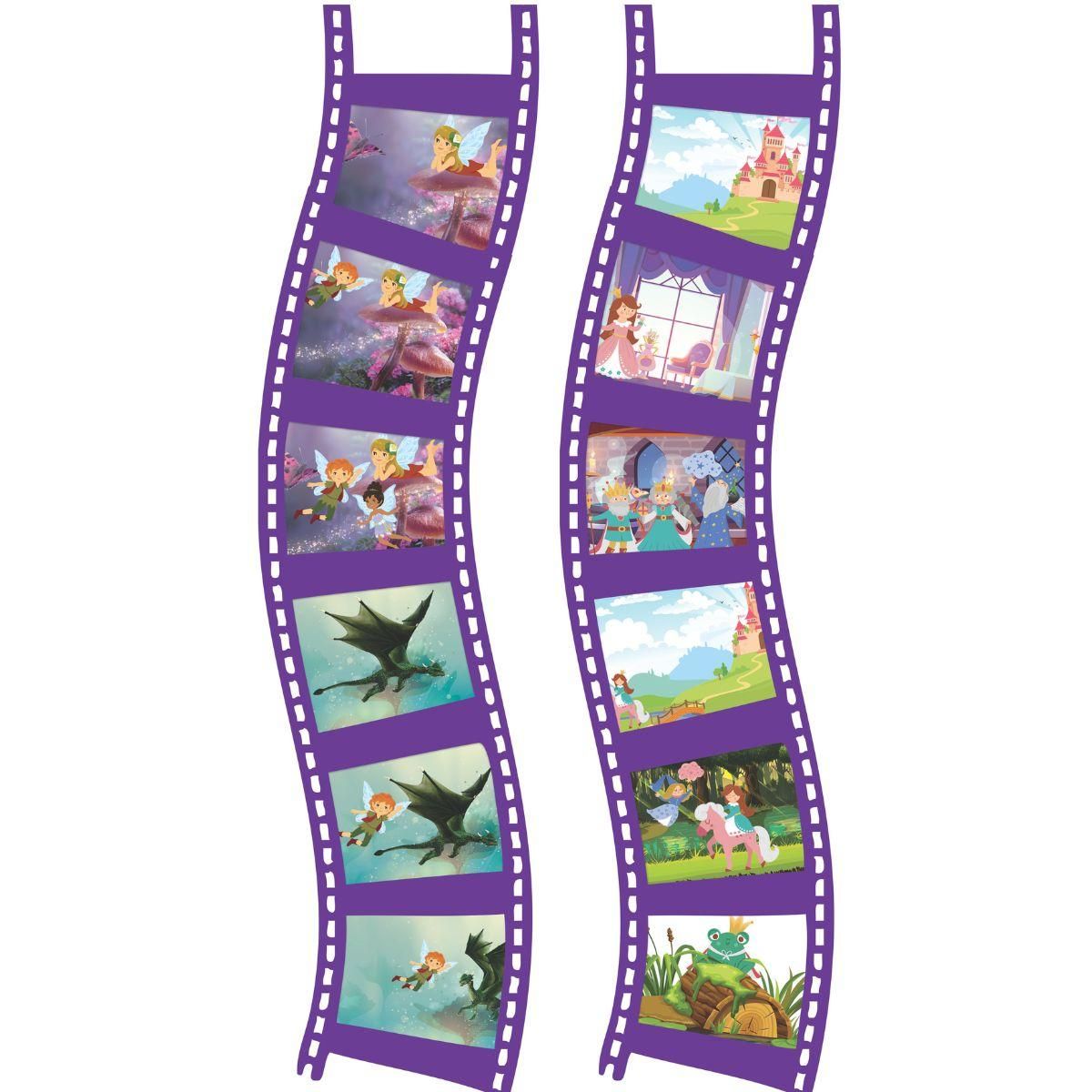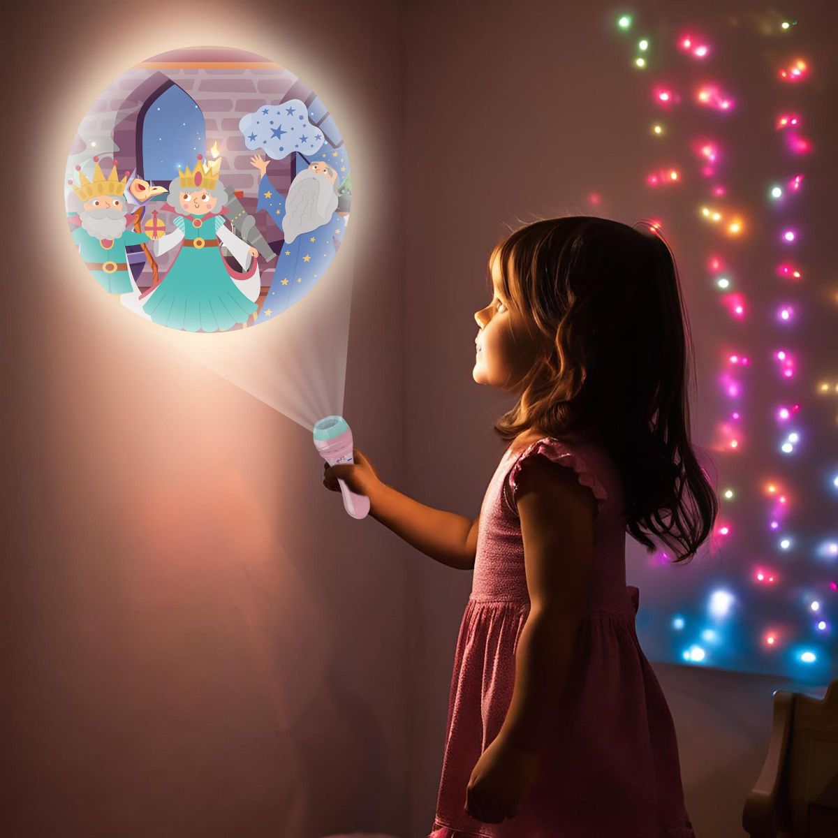 Stačí vložit jeden ze tří projekčních kotoučů a na stěně nebo stropě se objeví barevné scény s jednorožci, vílami a dalšími pohádkovými postavami. Celkem 24 obrázků nabízí prostor pro vlastní příběhy a rozvíjí dětskou představivost i slovní zásobu.