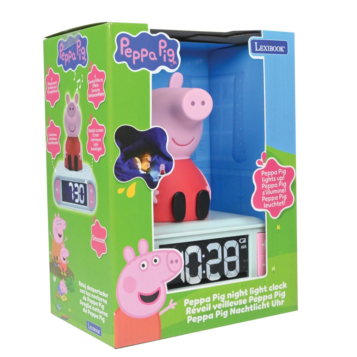 Budík Lexibook Prasátko Peppa s rozzářenou figurkou udělá z ranního vstávání zábavu! Děti si snadno nastaví čas díky přehlednému displeji a jednoduchému ovládání, které je vhodné už od šesti let.