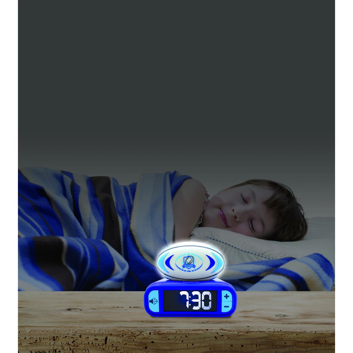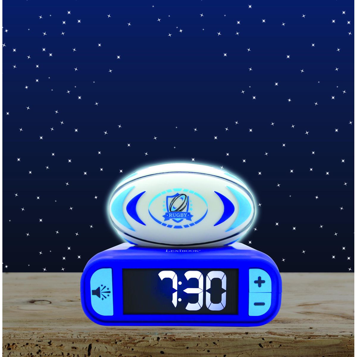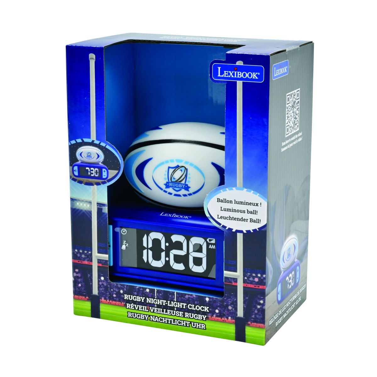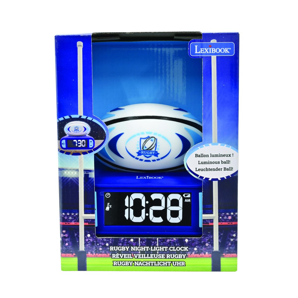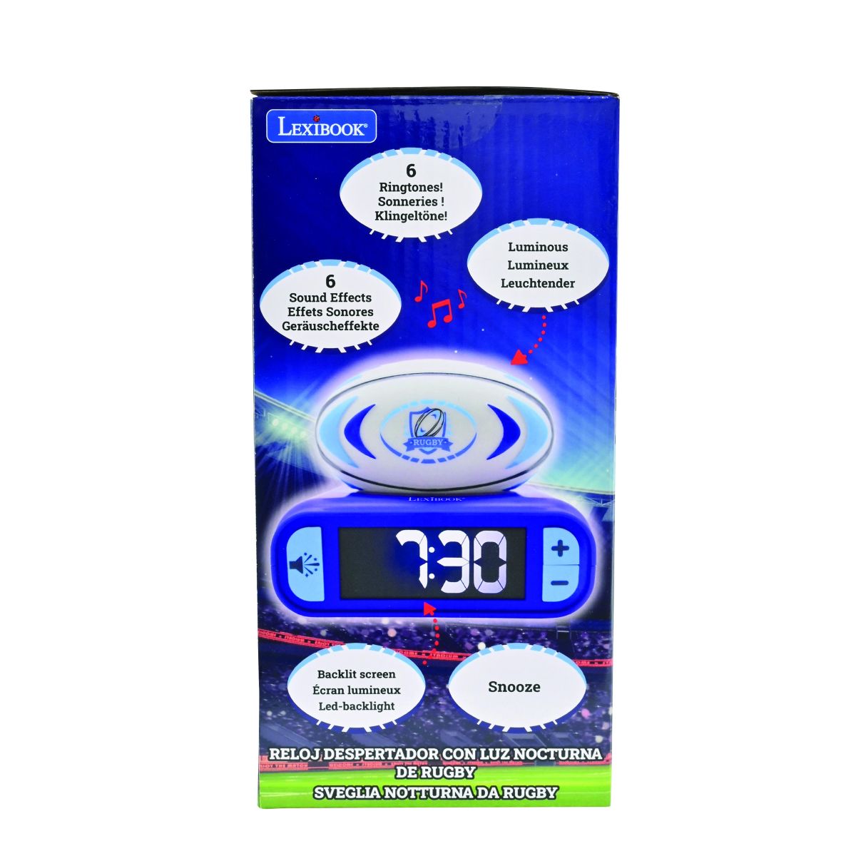 Lexibook budík rugby se svítícím míčem promění ranní vstávání v příjemný zážitek. Díky jednoduchému ovládání a jasnému displeji si s ním hravě poradí i děti od 6 let.