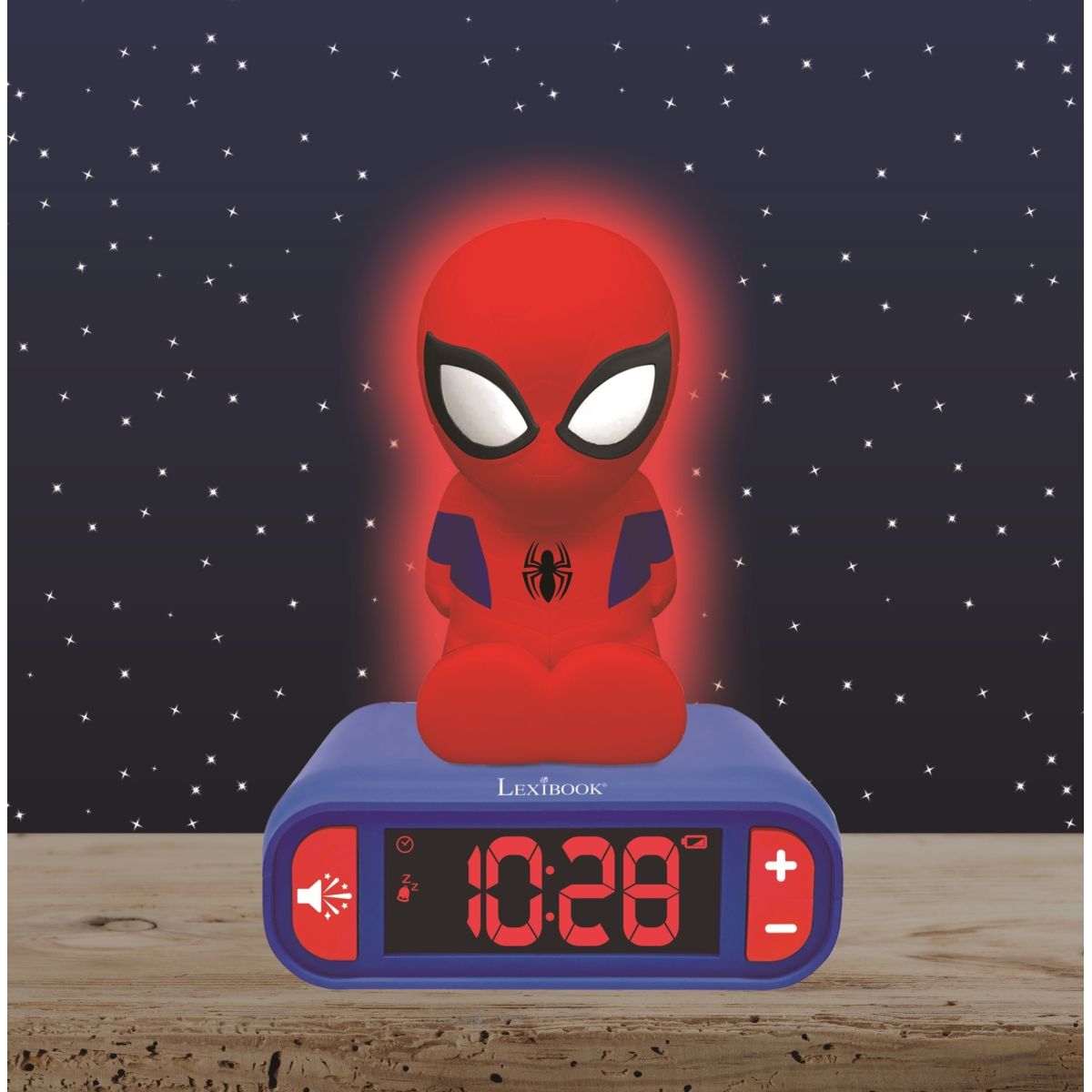 S Lexibook budíkem Spiderman se svítící figurkou bude každé ráno dobrodružstvím! Díky jasnému displeji a snadnému ovládání zvládnou děti budík nastavit sami.
