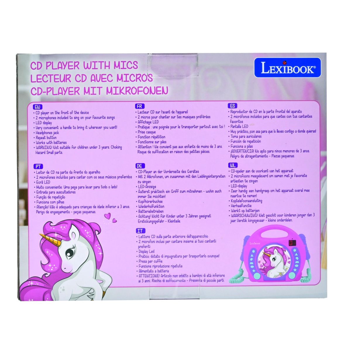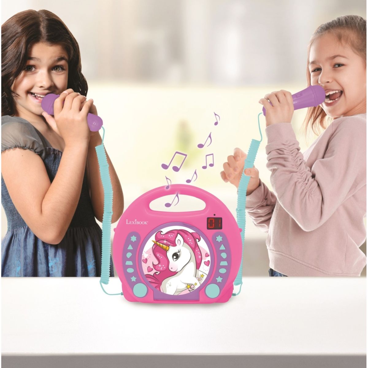 Lexibook CD přehrávač Jednorožec se 2 mikrofony je ideální zábava pro děti od 3 let, které rády zpívají a baví se s kamarády či rodinou. Díky dvěma mikrofonům mohou děti soutěžit v karaoke nebo společně tvořit veselou atmosféru při hrách a oslavách.
