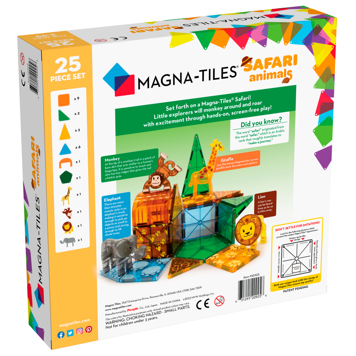 Sada Magna-Tiles Safari 25 dílků přináší dětem hodiny radosti při objevování světa safari zvířat jako slon, žirafa, opice či lev. Děti si mohou hravě stavět domovy pro své nové kamarády a zároveň rozvíjet jemnou motoriku i logické myšlení. Všechny dílky jsou vyrobeny z bezpečného netoxického plastu bez BPA a snadno se spojují díky pevným magnetům. Tento kreativní set je skvělý způsob, jak spojit hru s učením o přírodě a podpořit dětskou představivost.