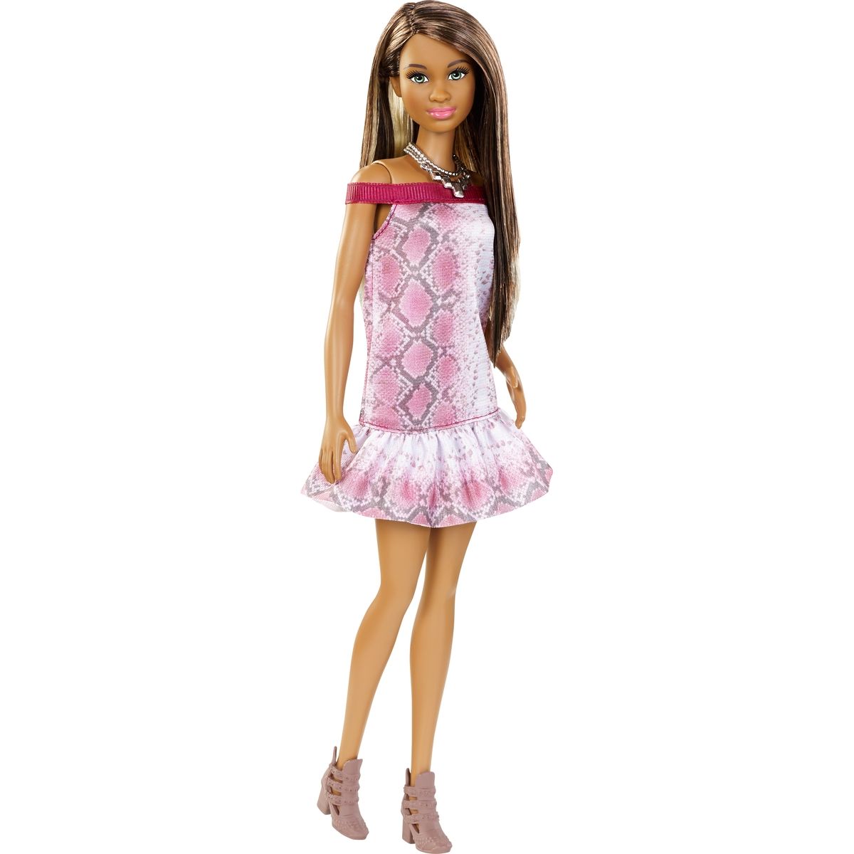 Barbie předvádí další ze svých slušivých modelů. Nová kolekce šatů přináší výběr z široké palety jedinečných kousků. Tentokrát má panenka šaty nad kolena, ukončené ve spodní části volánkem. Po odhalených ramenech jí splývají její dlouhé rovné vlasy.