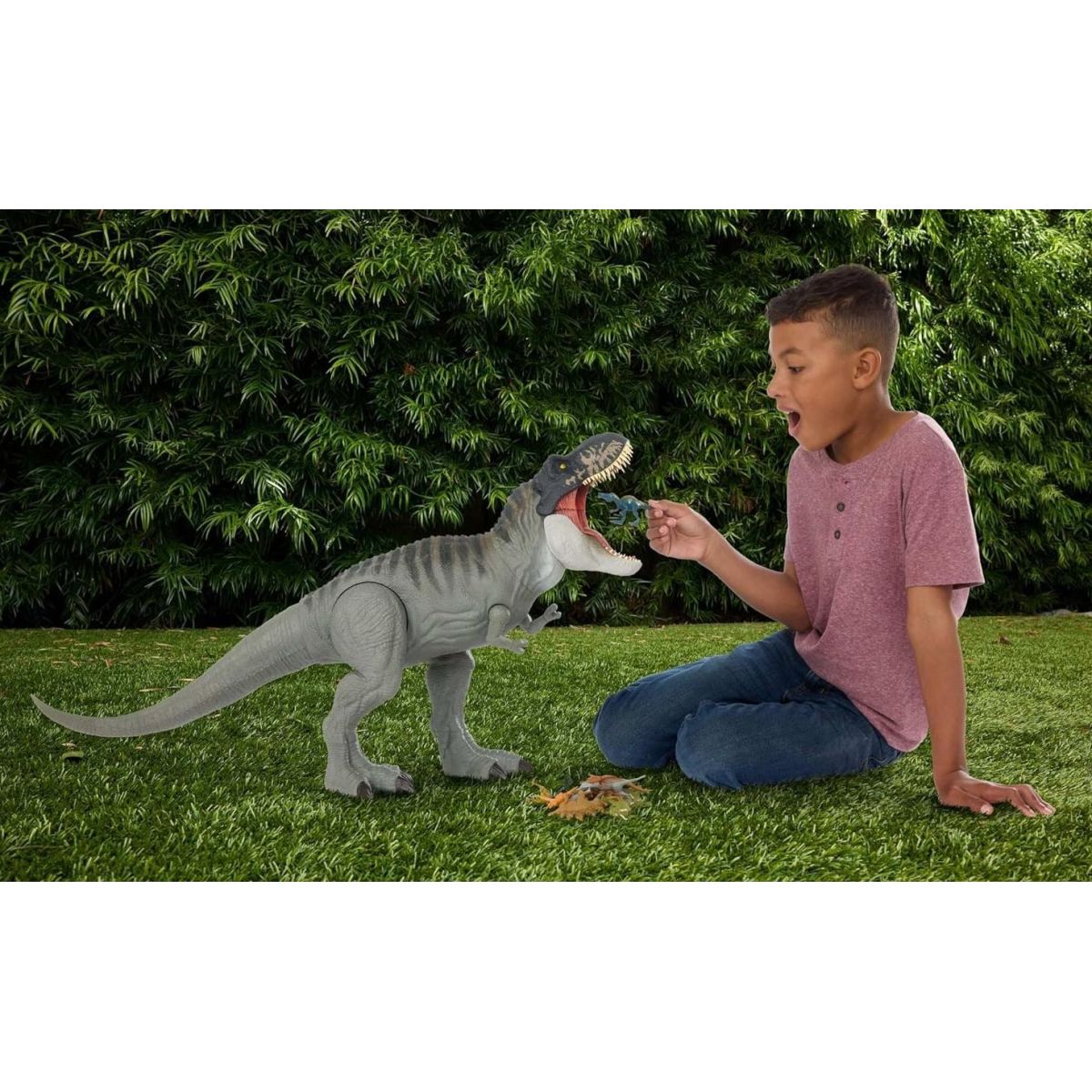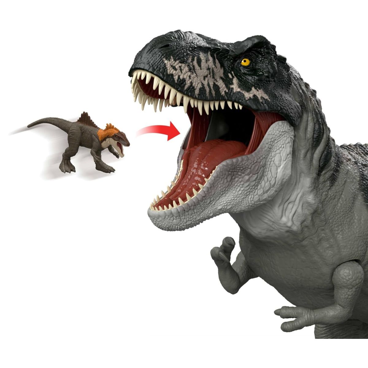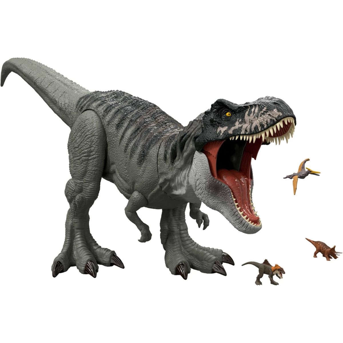 Otevři jeho masivní čelisti, nech ho „spolknout“ menší dinosaury a poté je vypusť otvorem v břiše – zábava, která nikdy nekončí! Díky realistickému filmovému vzhledu, pohyblivým kloubům a robustní konstrukci je tento T-Rex nejen hračkou, ale i sběratelským kouskem. Je připravený ovládnout každé dětské dobrodružství i každou sbírku dinosaurů!