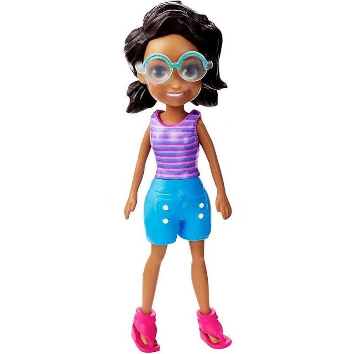 Tentokrát má panenka tmavé vlásky, na očích brýle, má oblečeny modré kraťásky a pruhované tričko bez rukávků. K nim ladí růžové boty.