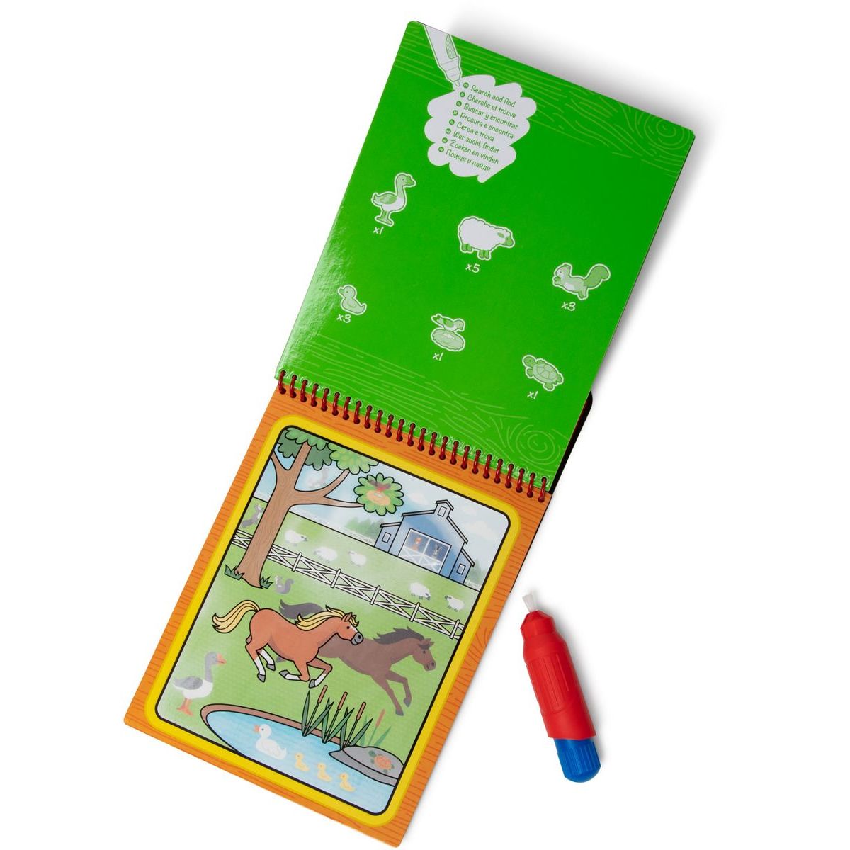 Naplň pero, dotkni se archu a sleduj, jak se z černobílých obrázků stávají barevné scény plné zvířátek, traktorů a života na venkově.