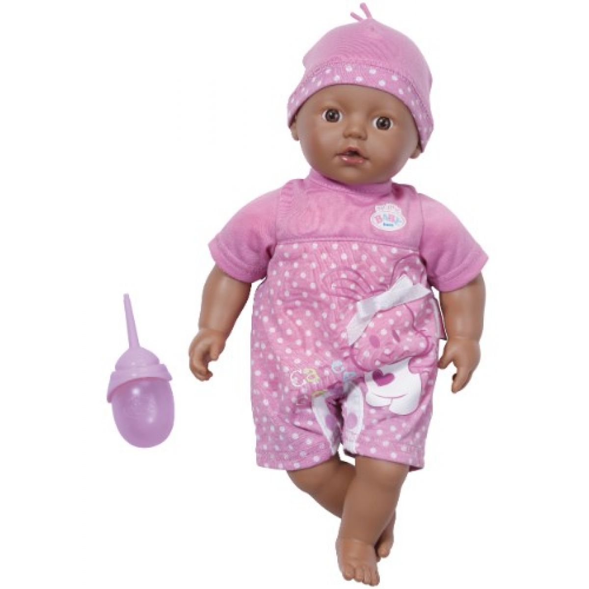 Snědá, koupací panenka s měkkým tělíčkem, vhodná pro nejmenší děti od 1 roku. Součástí panenky je lahvička.