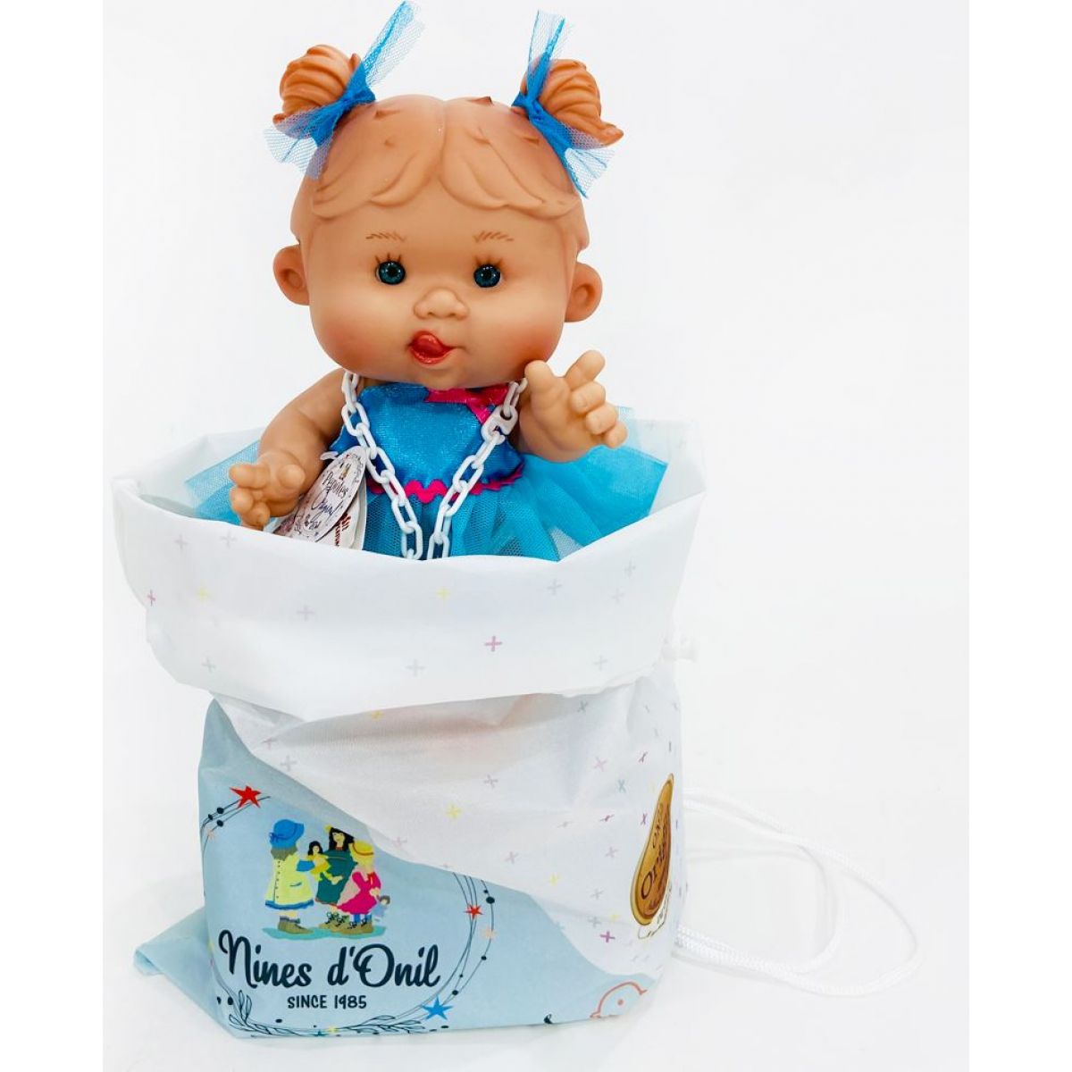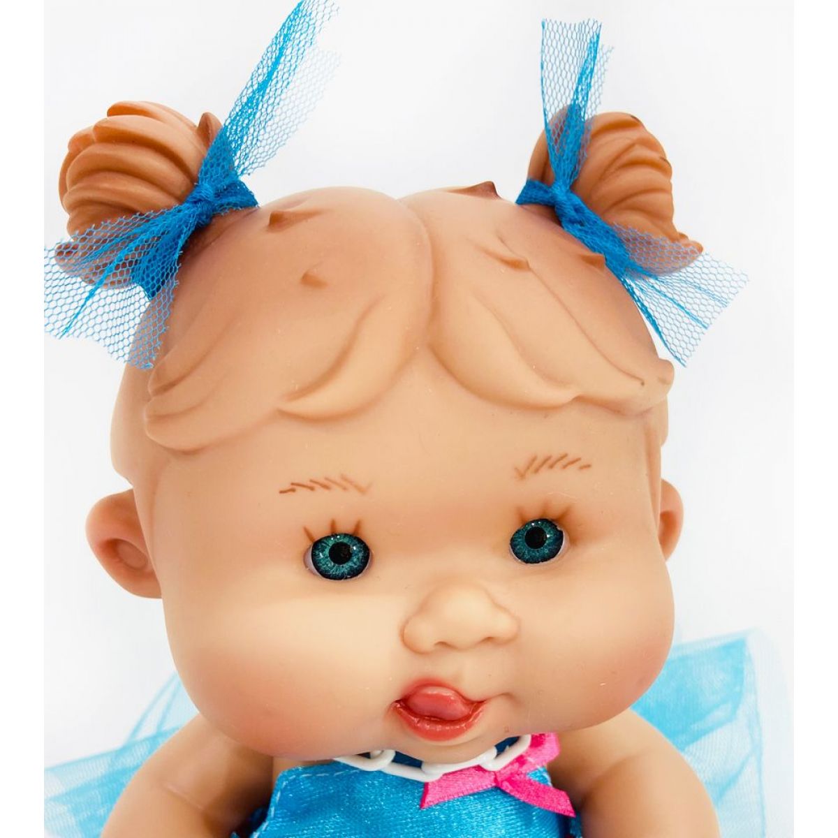 Vinylová panenka v modrých šatičkách čeká na holčičky od 3 let. Mohou ji vykoupat a uspat s malým růžovým dudlíčkem. Dudlík nelze vložit panence do úst.