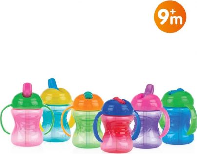 Červenomodrý netekoucí hrneček s tvrdým náustkem, jehož součástí je vnitřní brčko, je určen pro děti od devíti měsíců. Hrneček je anatomicky vytvarovaný, holčičkám a klukům se dobře drží v ručičkách, pokud ho právě nedrží za boční ouška.