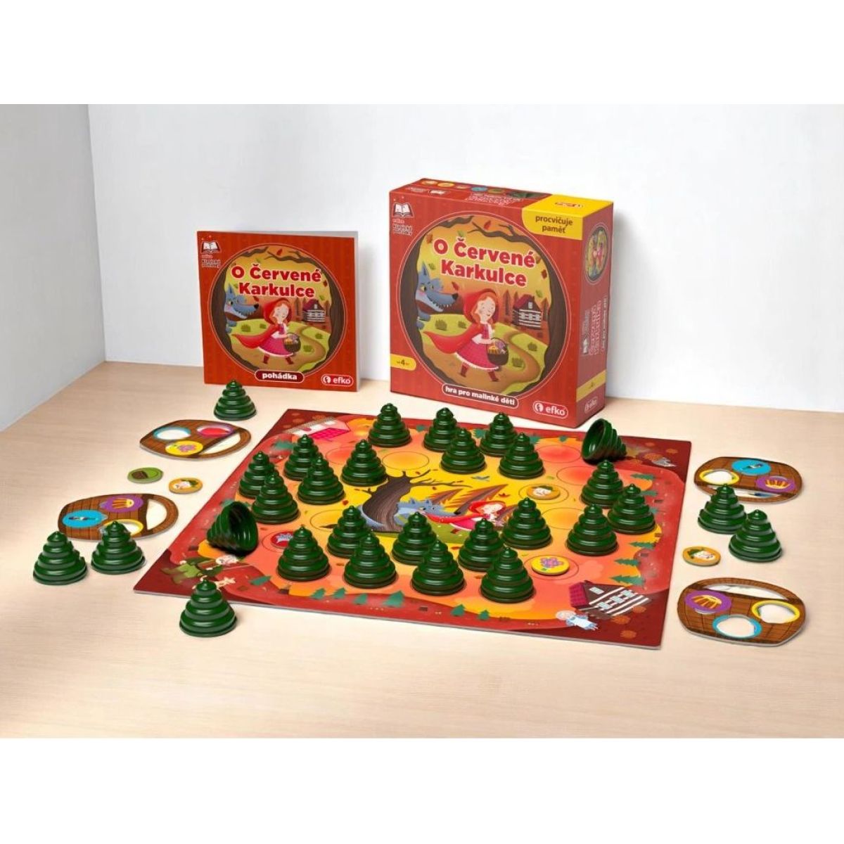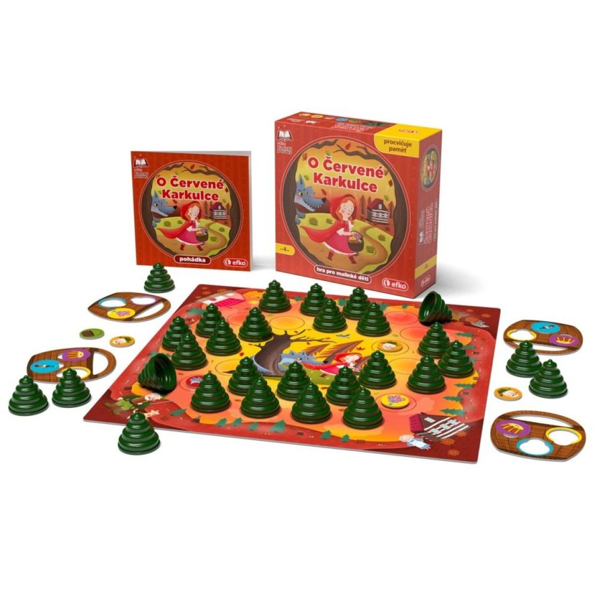 Obsah balení: herní plán 34 × 34 cm, 30 plastových stromečků, 4 košíčky, 34 žetonů, pohádka CZ/SK, návod CZ/SK