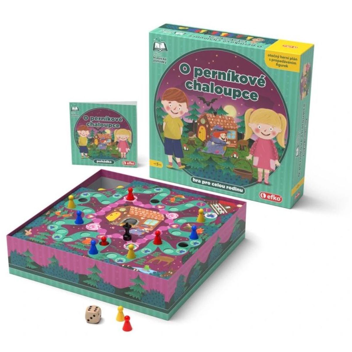 Obsah balení: 3D otočný herní plán (31,5 × 31,5 × 7,5 cm), 13 figurek (Jeníček, Mařenka, tatínek, Ježibaba), hrací kostka, pohádka CZ/SK, návod CZ/SK