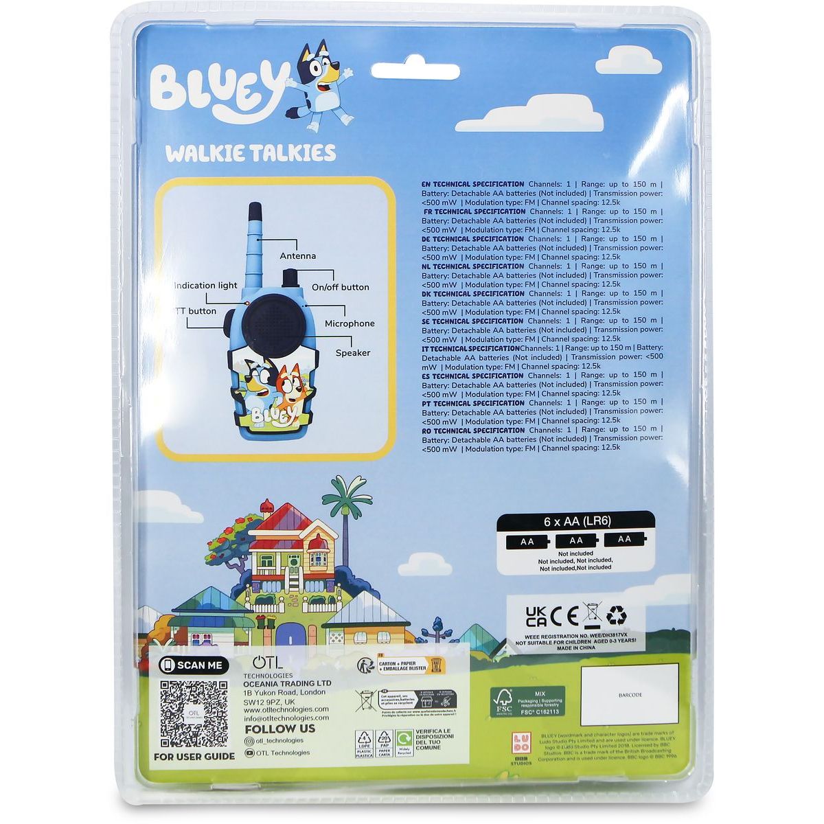 Sada vysílaček OTL Technologies Bluey je skvělým společníkem pro děti od 3 let, které rády objevují svět kolem sebe. Jednoduché ovládání tlačítkem Push-to-Talk umožňuje malým rukám snadno komunikovat bez složitostí. Vysílačky mají dosah až 150 metrů, což dovoluje hrát si venku i uvnitř a být pořád ve spojení s kamarády nebo rodiči. Křišťálově čistý zvuk zajistí pohodlné povídání bez šumu a díky lehkému a odolnému provedení vydrží i náročnější dětské hry. Na provoz jsou potřeba tři AA baterie na každý kus, které nejsou součástí balení.