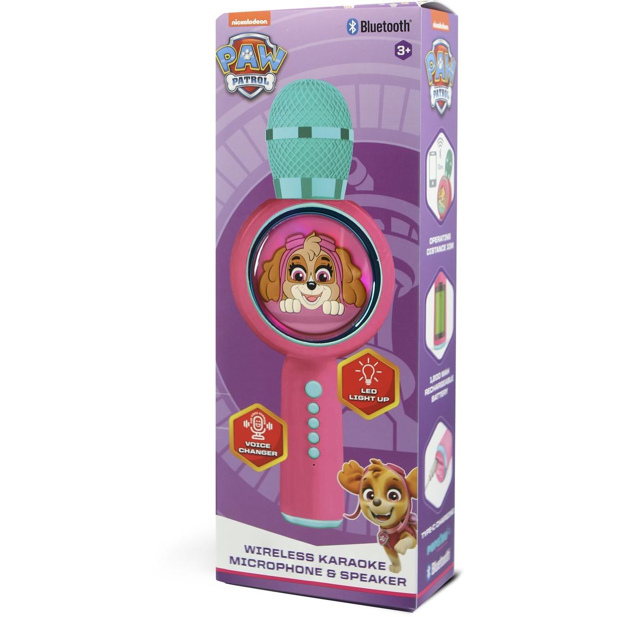 Mikrofon PAW Patrol Skye PopSing LED je skvělým společníkem pro všechny malé zpěváky od 3 let. Přináší čistý a hlasitý zvuk díky Bluetooth reproduktoru a snadno se ovládá pomocí praktického panelu tlačítek. Kompatibilní s iOS, Android zařízeními i tablety, umožní zpívání oblíbených písniček doma i na cestách. Barevný design s motivem Paw Patrol udělá radost každému dítěti. Vestavěná baterie vydrží až 5 hodin hraní a jednoduše se nabíjí přes USB kabel, který je součástí balení.
