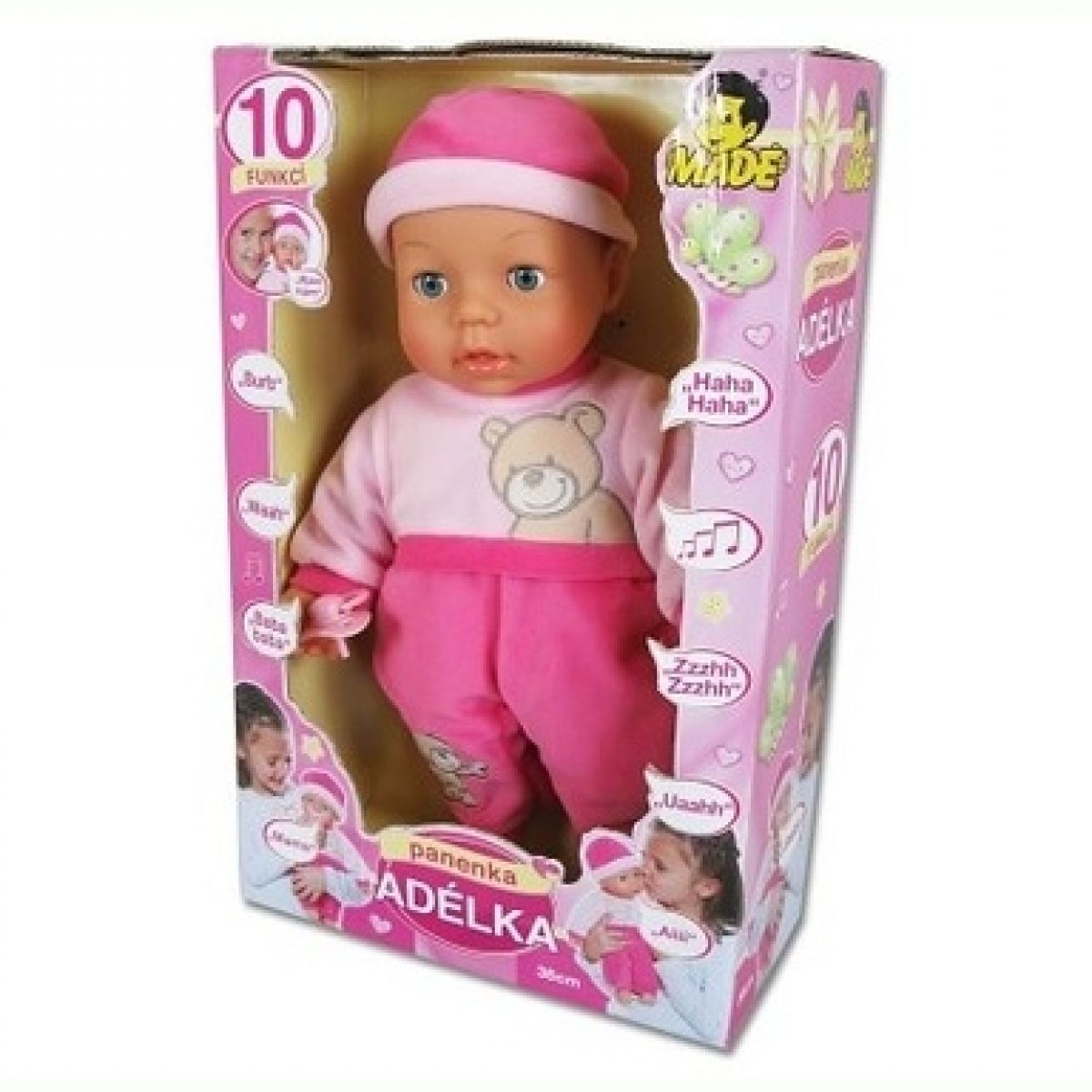 Panenka Adélka s dudlíkem je ve svém růžovém oblečku čeká na holčičky od 2 let, které chtějí panenku pochovat a utěšit ji pokud bude plakat, poslechnout si, jak se bude smát, žvatlat a plakat.