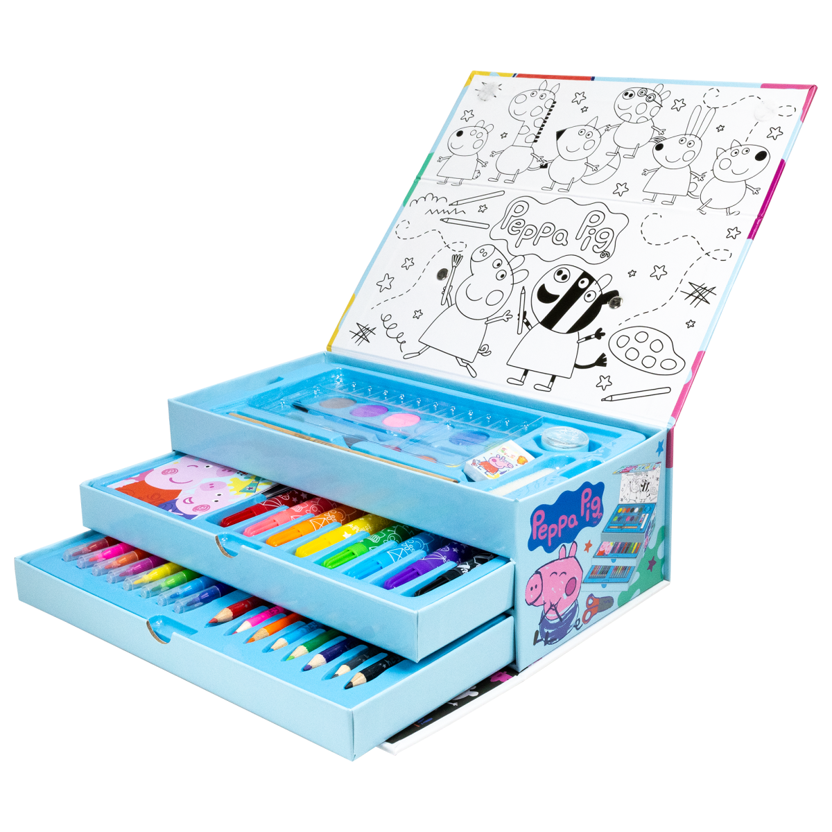 Tento praktický kreativní box obsahuje vše potřebné pro kreslení, malování i psaní. Díky třípatrové konstrukci je každý nástroj přehledně uložen a snadno dostupný. Sada zahrnuje širokou škálu výtvarných pomůcek, které podporují dětskou fantazii a rozvíjejí tvořivost.