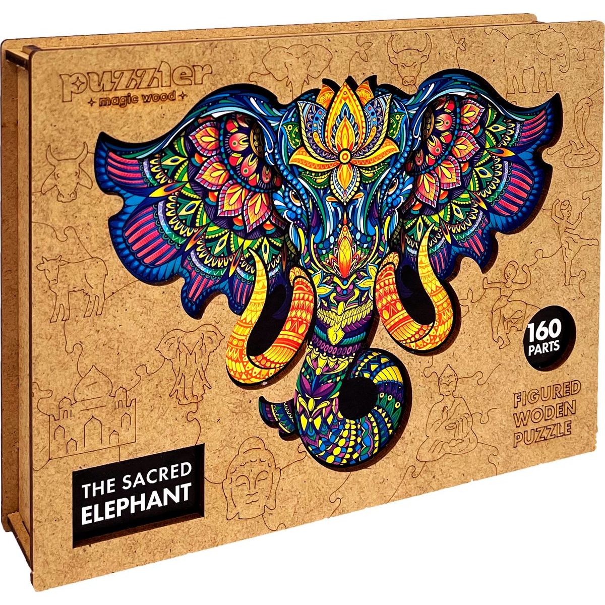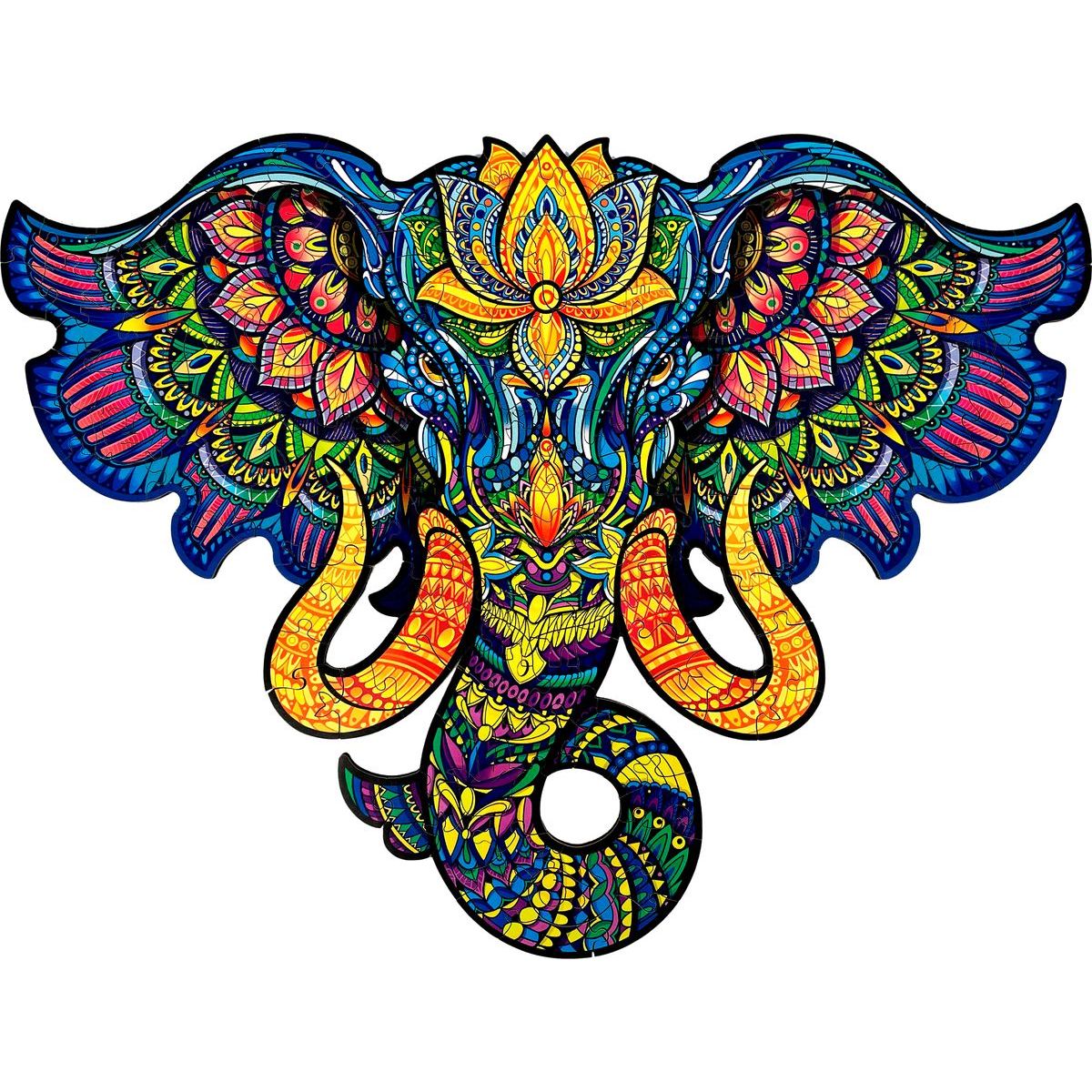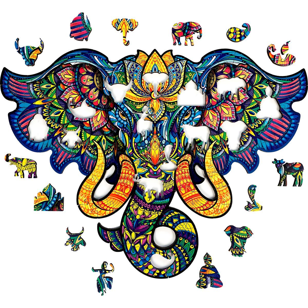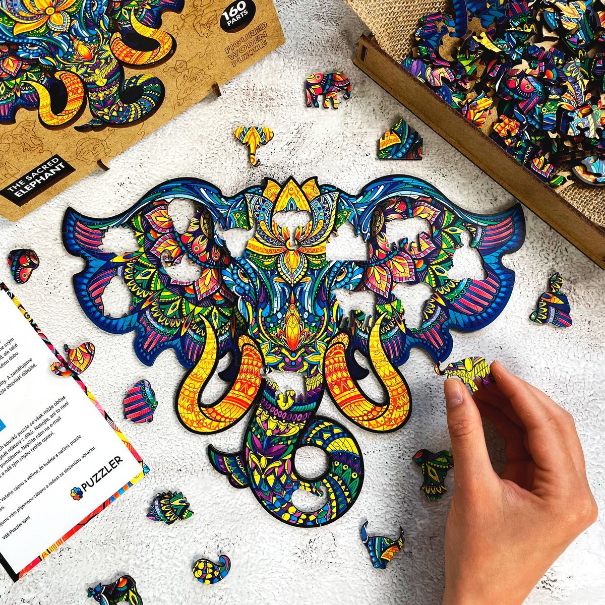 Posvátný slon se stal námětem pro dřevěný barevný puzzle obrázek, který si mohou děti sestavit z připravených dílků.