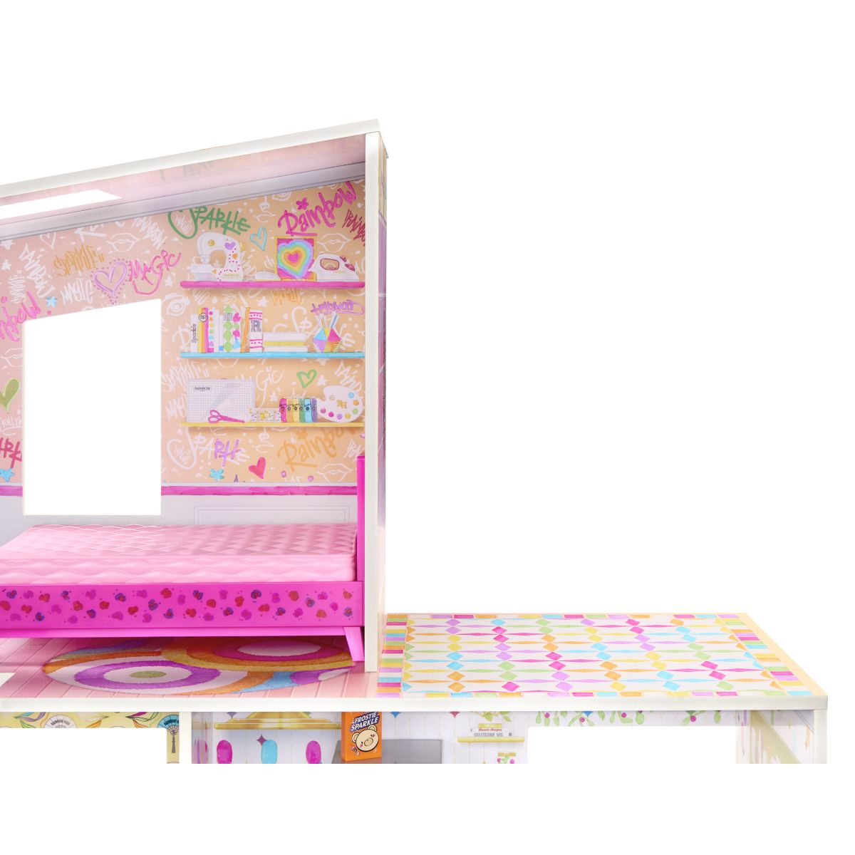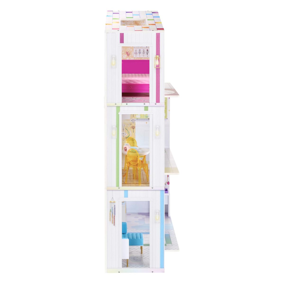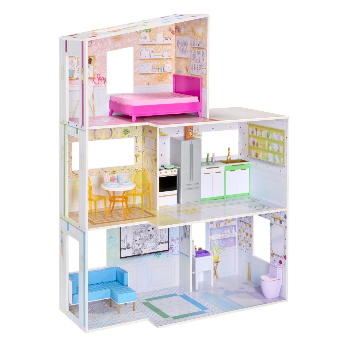 Tento barevný dům Rainbow High Color promění každou hru v úžasné dobrodružství plné malování a tvoření! Děti od 4 let mohou využít šest omyvatelných duhových fixů k vybarvení zdí, podlah i doplňků v pěti místnostech třípatrového domečku. Pokud chcete změnit barvy, stačí fixky setřít a začít malovat znovu. Barevný nábytek a doplňky dodávají domečku živost a umožňují dětem rozvíjet svou fantazii hravým způsobem. Vhodné pro děti od 4 let Materiál: dřevo Rozměry balení: 78.74 x 43.18 x 34.29 cm Hmotnost balení: 22.73 kg