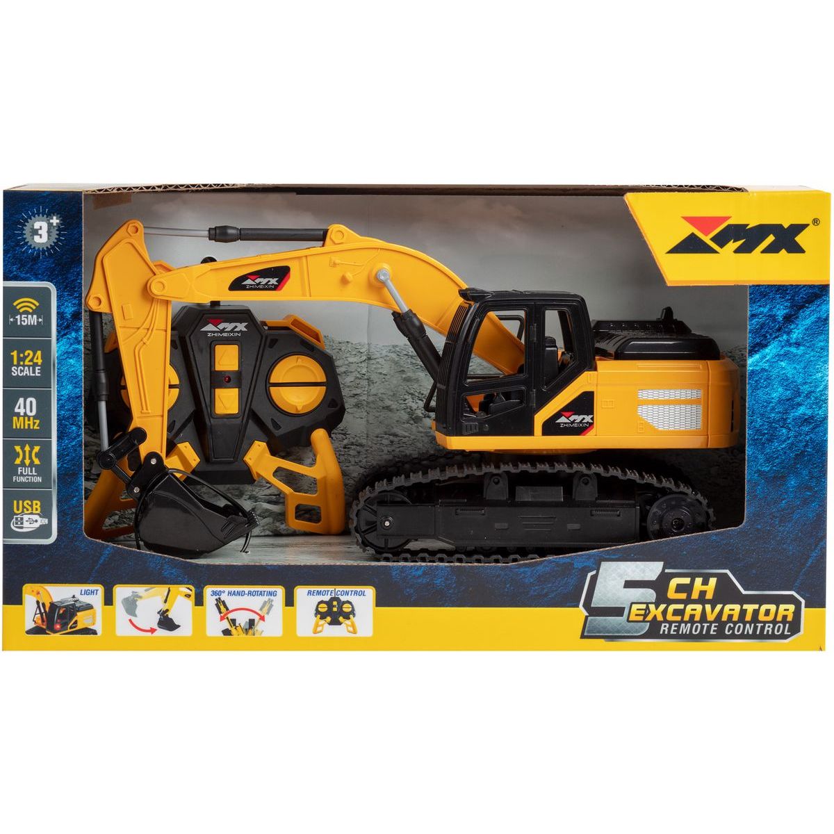 Realistický RC bagr v měřítku 1:24 s plným ovládáním: jízda vpřed/vzad, otáčení, zvedání a spouštění lžíce, 360° otáčení věže. Ovládání probíhá na frekvenci 40 MHz, dosah dálkového ovladače je 10–15 m. Bagr má světelný efekt, USB nabíjení a dosahuje rychlosti 2–3 km/h. Specifikace: 5 kanálů, plná funkčnost Světelný efekt Frekvence: 40 MHz (40,66–40,9 MHz) Výkon: max. 95 dBm Dosah: 10–15 m Rychlost: 2–3 km/h USB nabíjení Ideální hračka pro malé stavitele i technické nadšence!