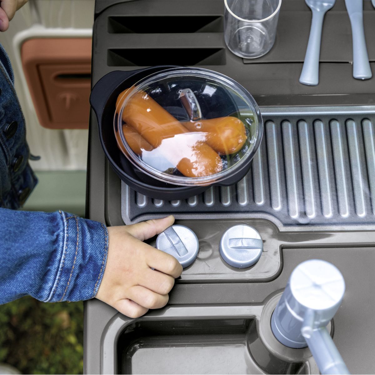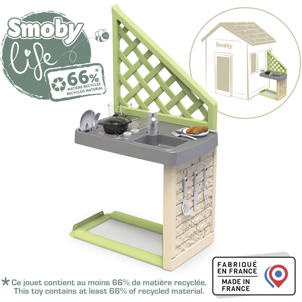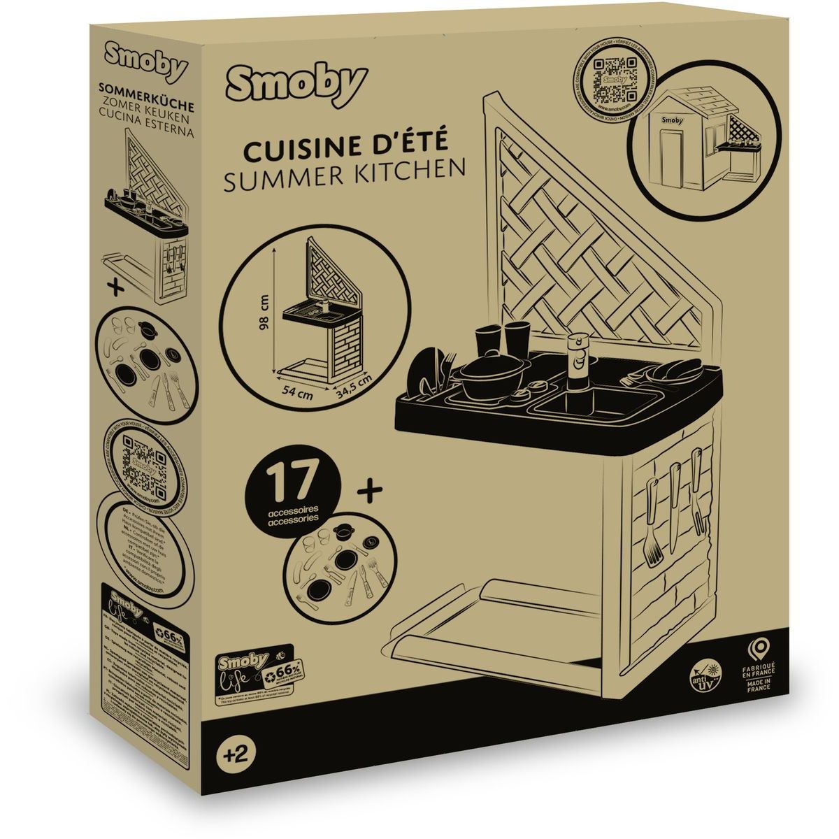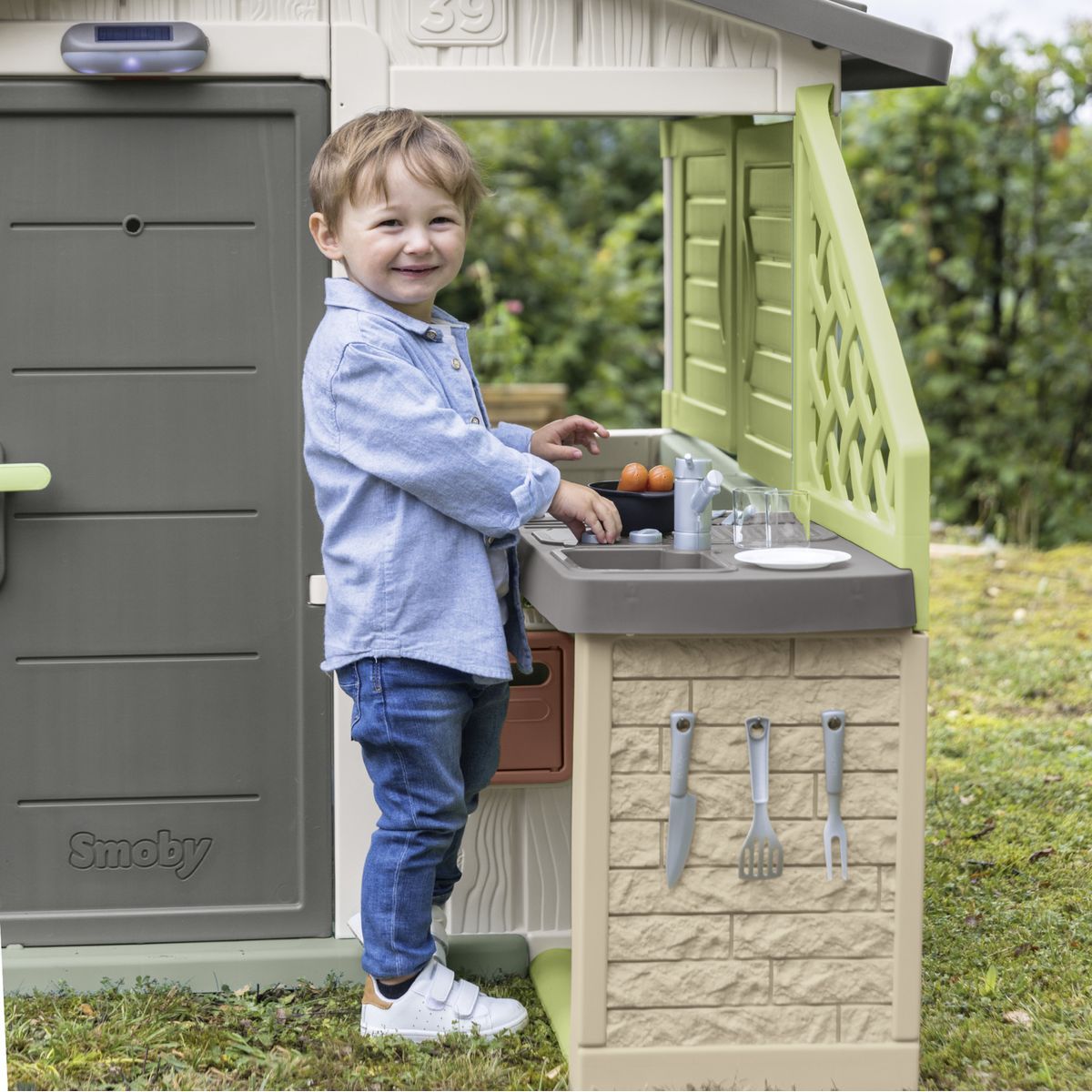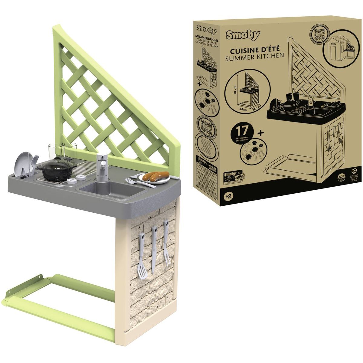 Doplňte dětský domeček o zábavnou letní kuchyňku, která přináší nové možnosti hry na vaření. Skládá se z grilu, umyvadla s kohoutkem a 17 doplňků jako jsou sklenice, talíře, klobásy, příbory a hrnec s poklicí. Kuchyňka je určena pro domečky Smoby z různých řad a je ošetřena UV ochranou pro delší životnost barev. Vyrobena z ekologického plastu s 66% podílem recyklovaného materiálu. Rozměry: 54 x 34,5 x 98 cm.