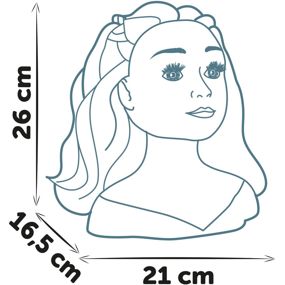 Česací hlava s výškou 26 cm nabízí spoustu možností pro česání a vytváření trendy vzhledů. Pomocí štětečku a studené vody lze aktivovat speciální efekt – rty změní barvu. Všechny doplňky (celkem 19 ks) lze schovat do tajné přihrádky v podstavci. Přísavky na spodní části zajišťují pevné uchycení a snadnou práci.