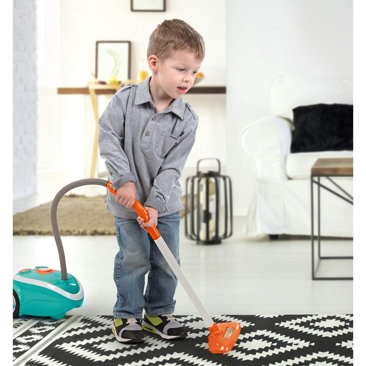 Dětský vysavač vydává zvuk vysávání. Je nízké hmotnosti, dobře se s ním dětem pohybuje. Barevné kuličky v hlavici imitují vysávání nečistot.