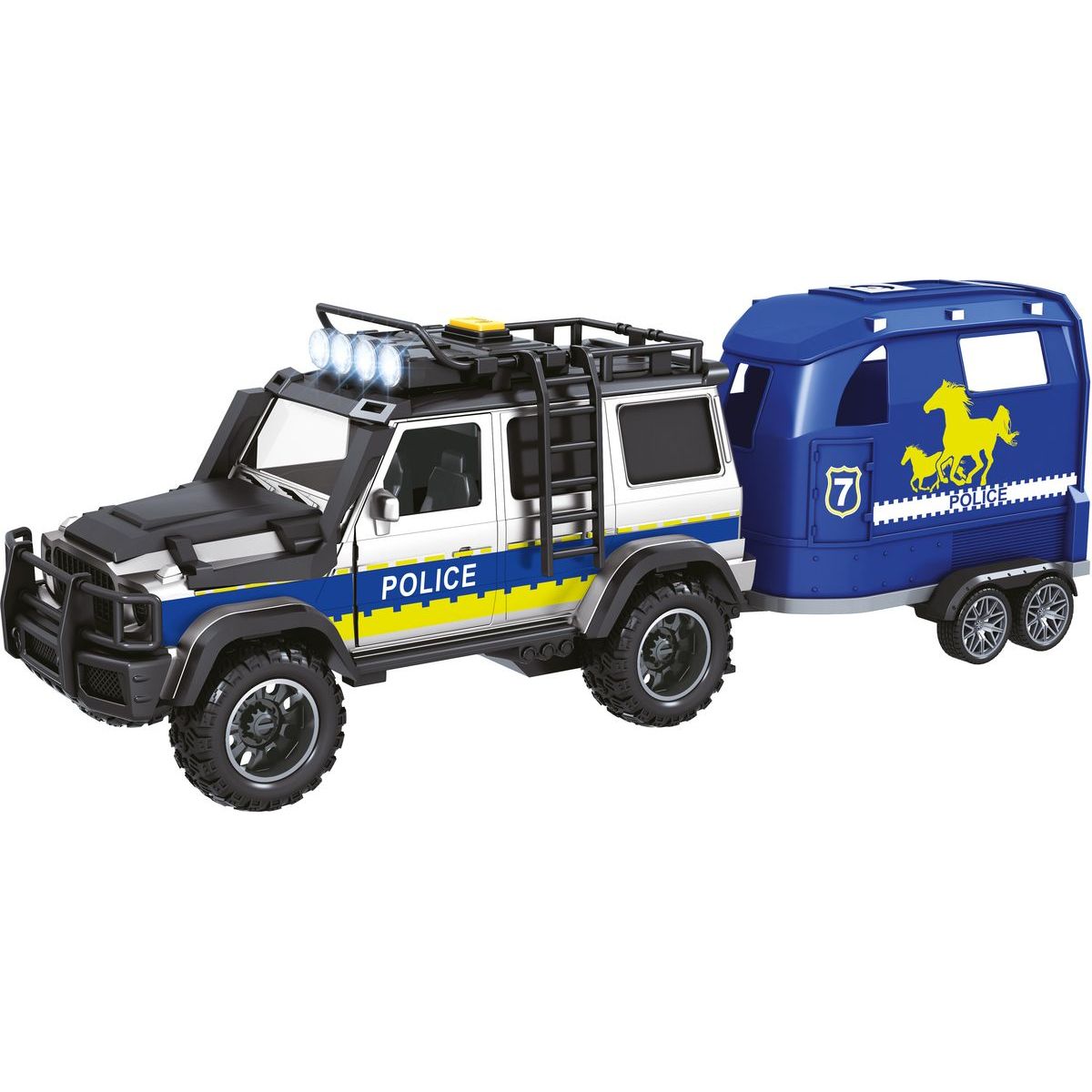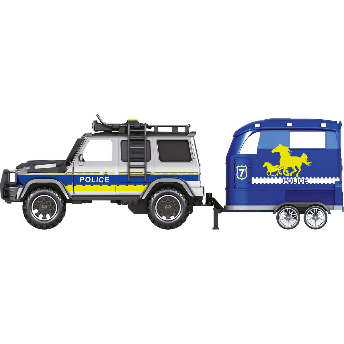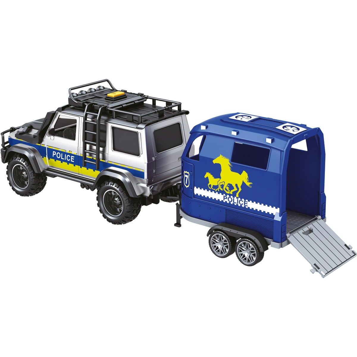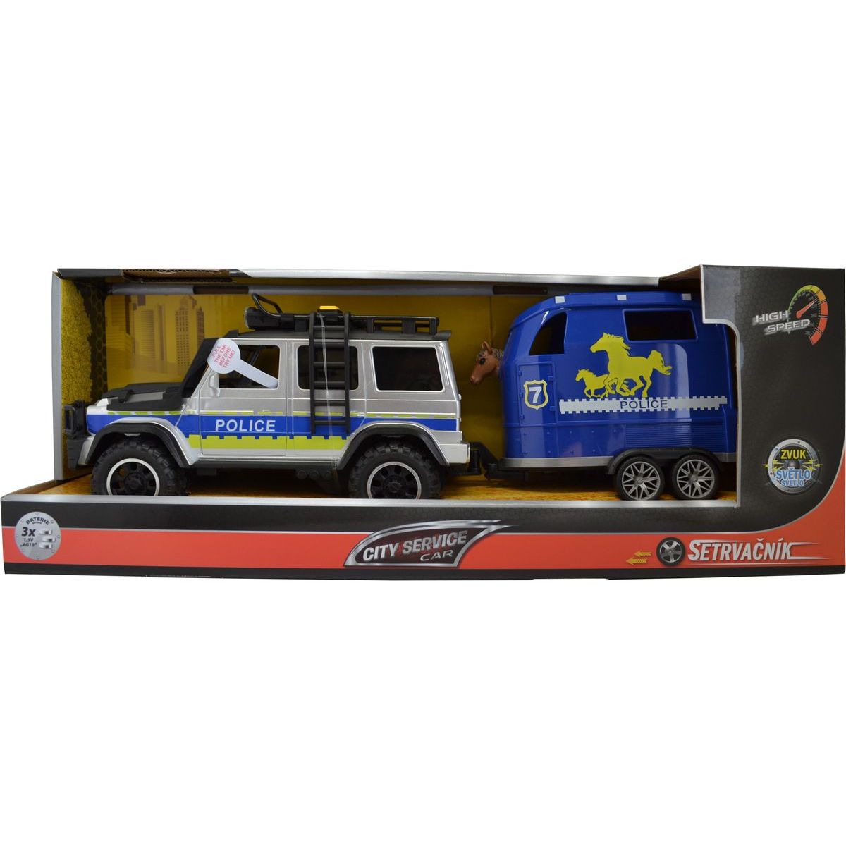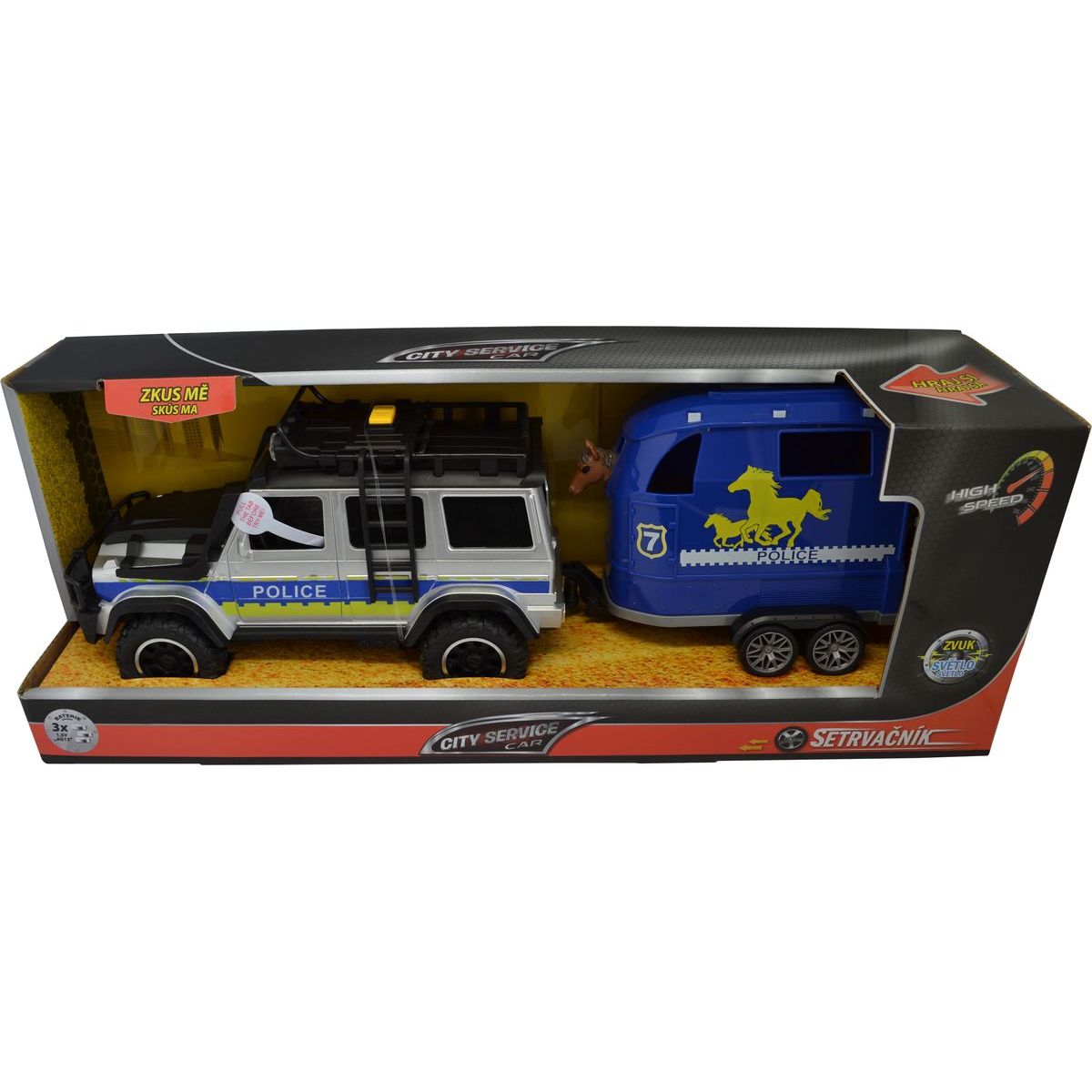 Obsah balení: policejní auto, přívěs, kůň