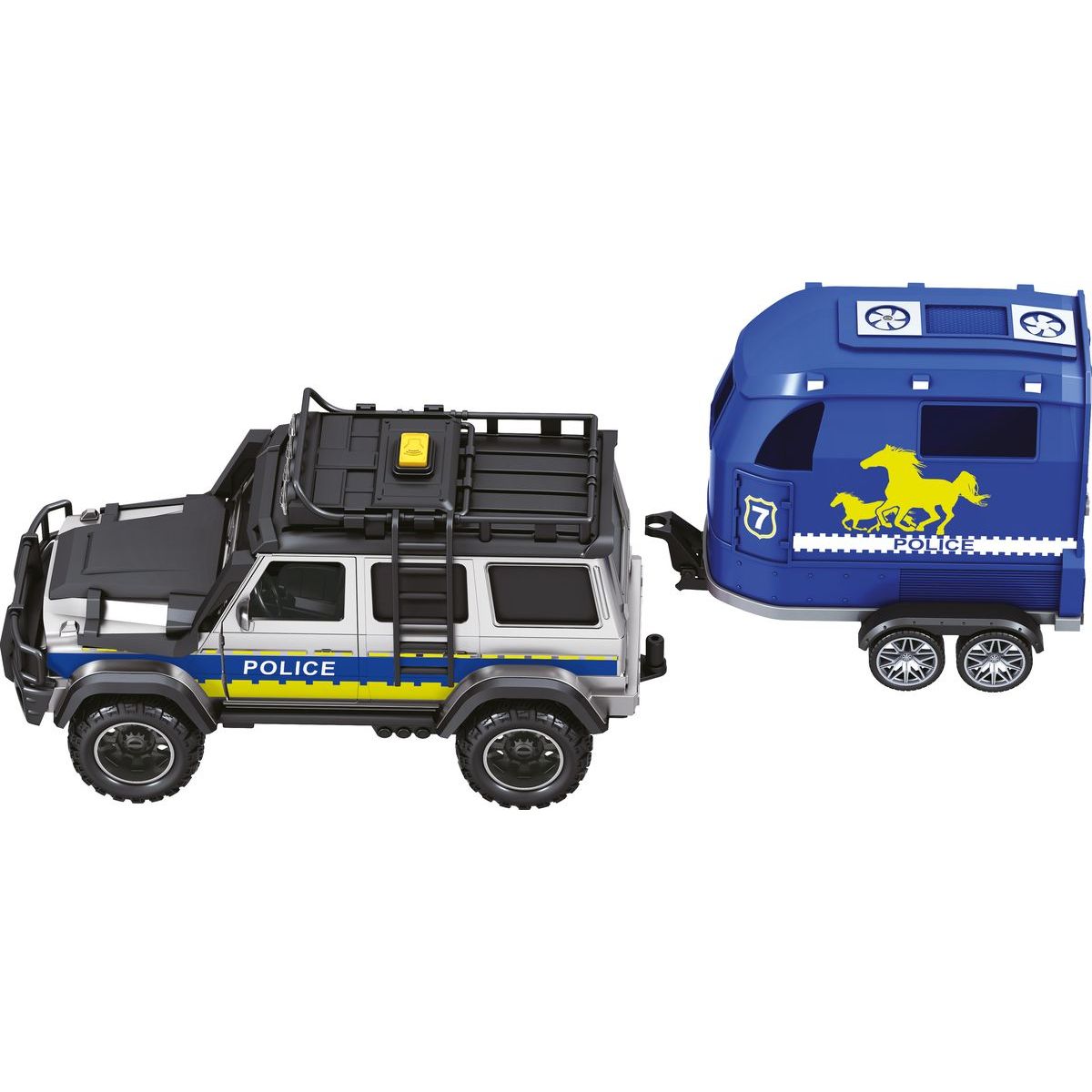 Přívěs umožňuje bezpečně přepravovat koně, takže děti mohou simulovat převoz policejního koně na zásah nebo trénink. Díky měřítku 1:14 je model dostatečně velký, aby zaujal na první pohled a zároveň se pohodlně ovládal při hře.