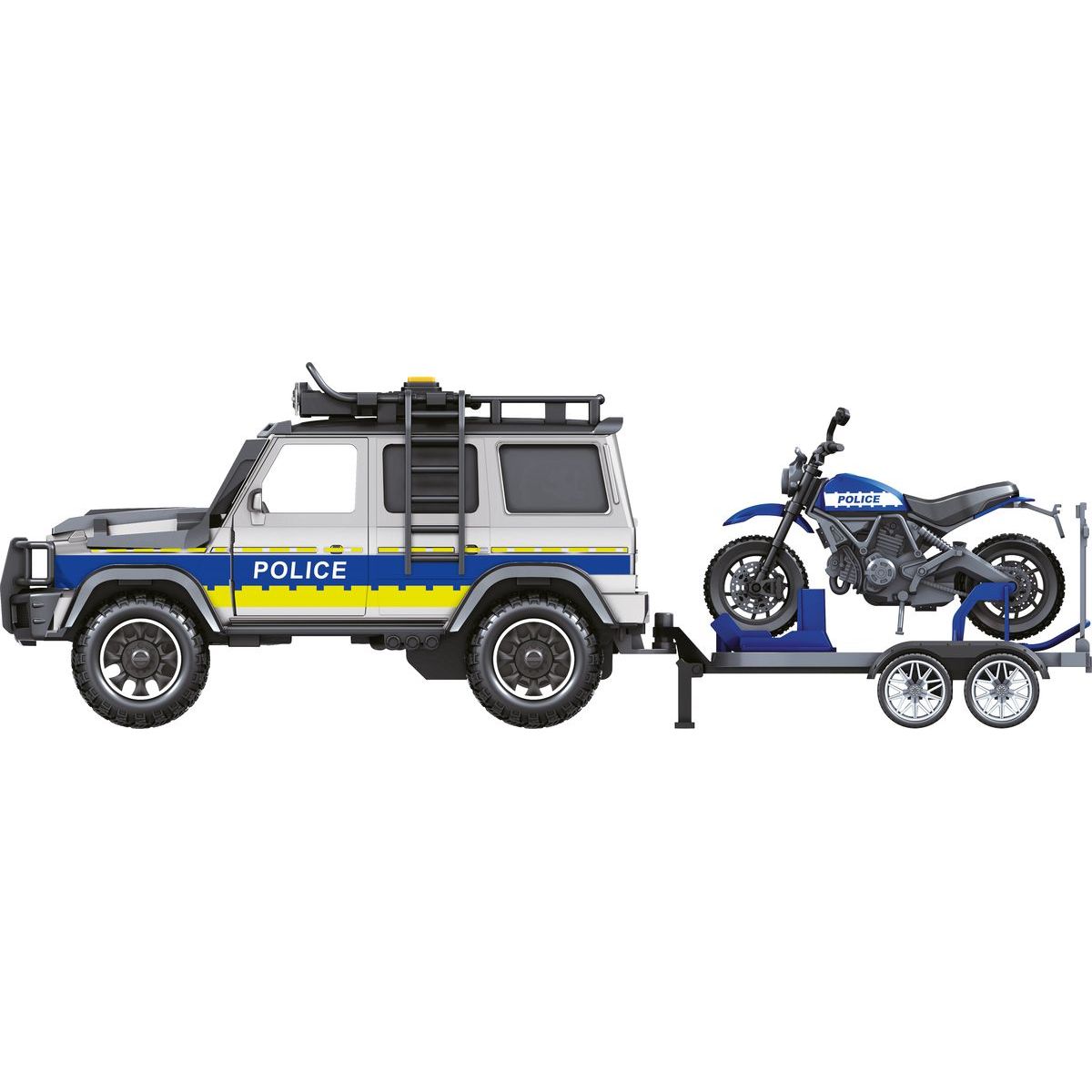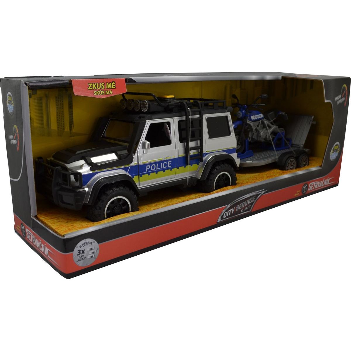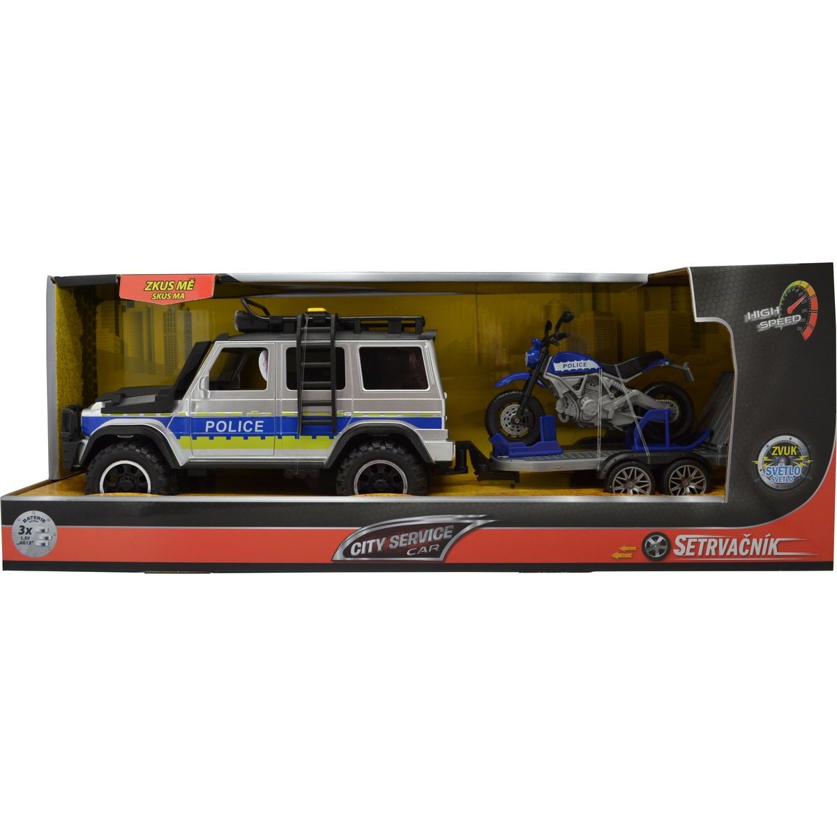 Toto policejní auto Sparkys CITY SERVICE CAR s přívěsem a motorkou potěší každé dítě od 3 let. Se zvukem a světly ožívá hra jako opravdová akce! Motorka na přívěsu umožňuje různé dobrodružné příběhy, kde můžeš zachraňovat město nebo hlídat klid v ulicích. Baterie LR44 jsou už v balení, takže stačí rozbalit a hrát si naplno bez čekání.