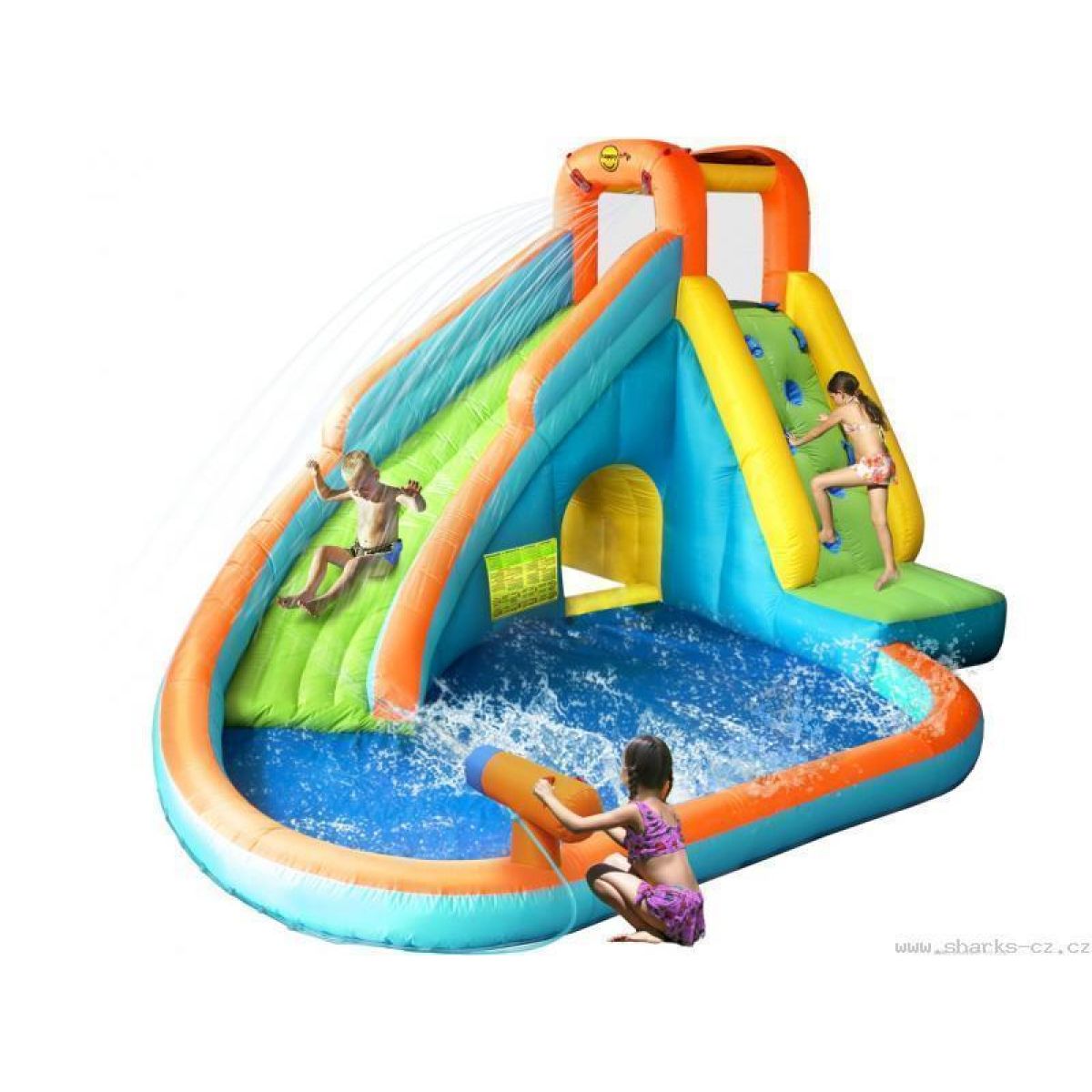 Velká nafukovací skluzavka s bazénem a vodním dělem. Lezecká stěna vedoucí ke klouzačce. Skluzavka s tekoucí vodou pro lepší skluz.