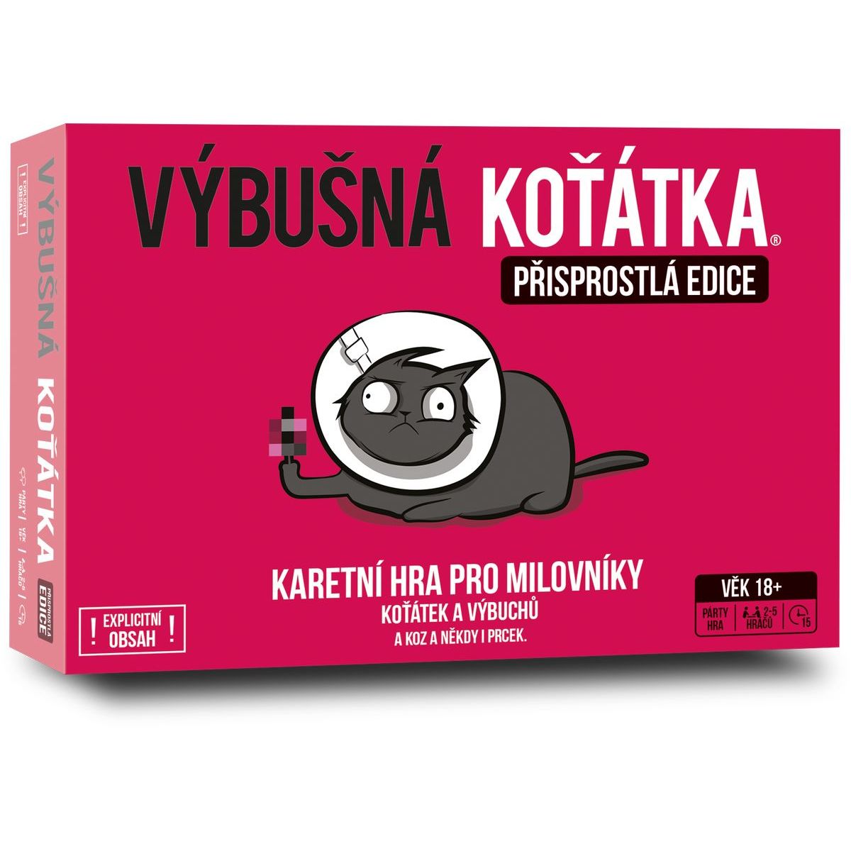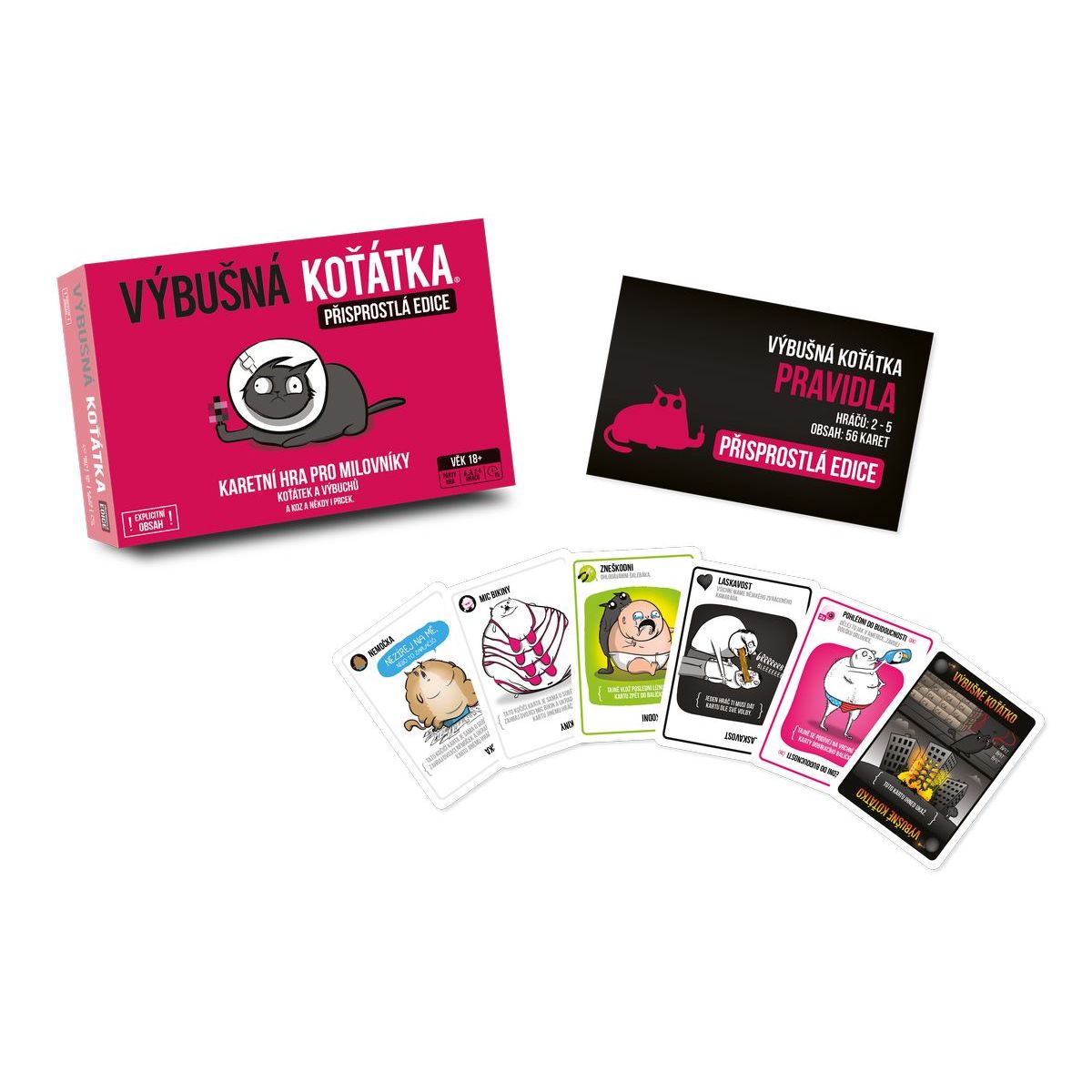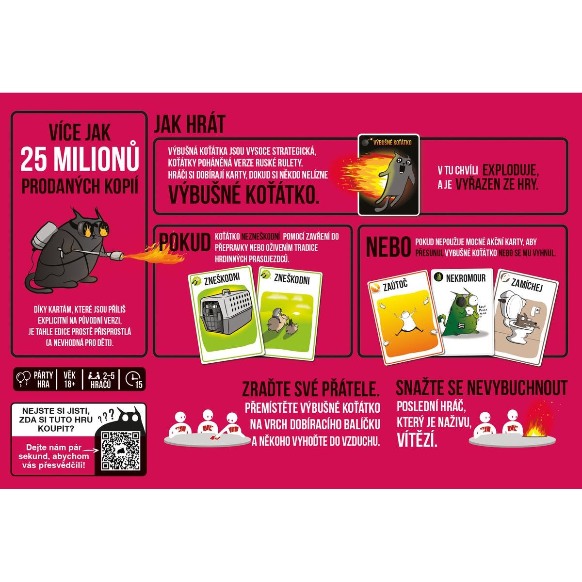 Karty jsou v této edici ozvláštněny neuctivým, absurdním a lehce nechutně-geniálním grafickým stylem, který prostě nemůže být součástí standardní hry. Balení obsahuje kompletní verzi Výbušných koťátek, 56 karet a česká pravidla. Přidáním dalšího balíčku může hrát až 9 hráčů – ideální pro bujaré večírky i noční herní maratony.