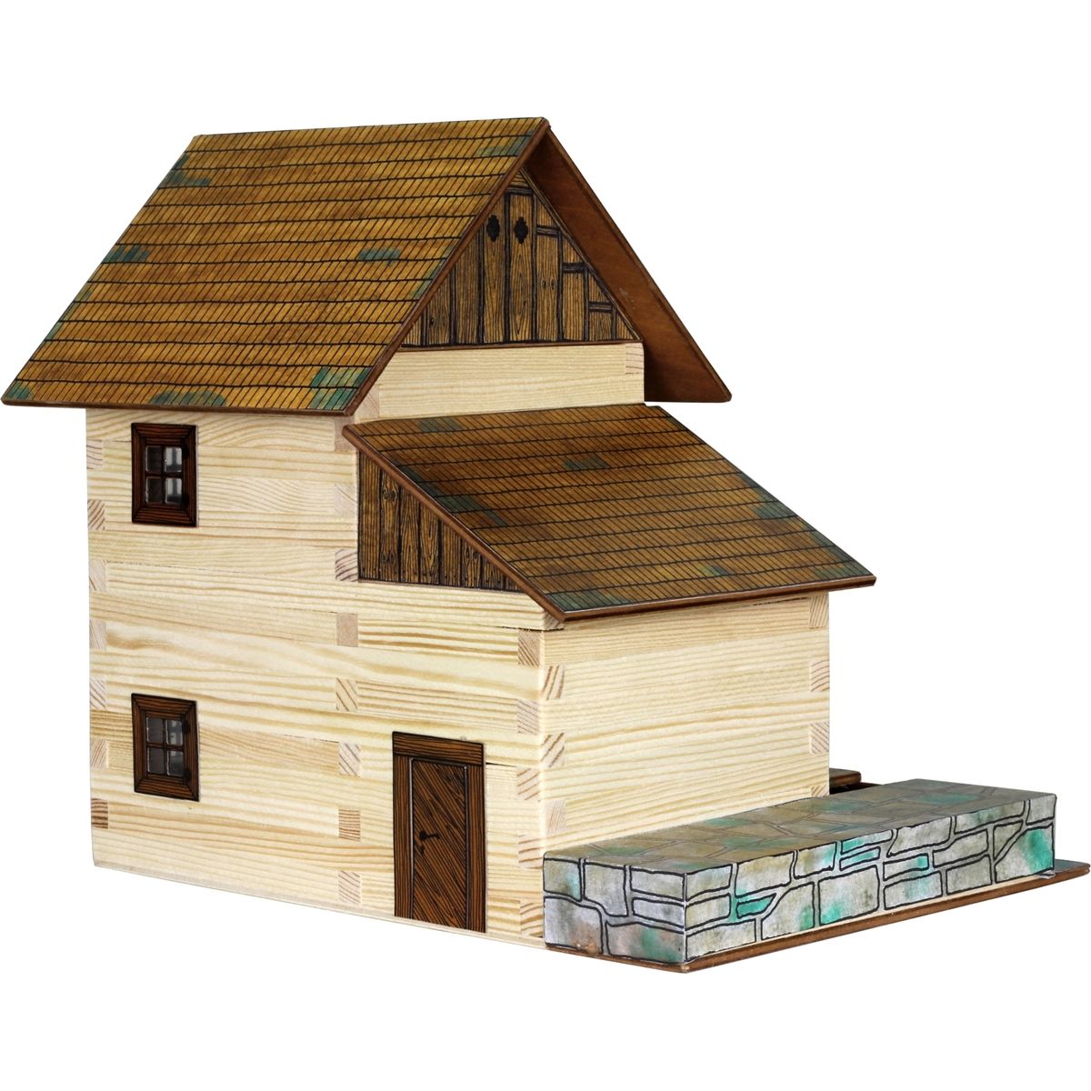 Krásná dřevěná stavebnice. Hranolky o průřezu 9 x 9 mm se slepují klasickým lepidlem, které není součástí balení. K nim potom také štíty, okna, dveře, střechy i stříšky z kartonu, okna z folie. Brusný papír není téměř potřeba, dílky jsou opracovány dobře.