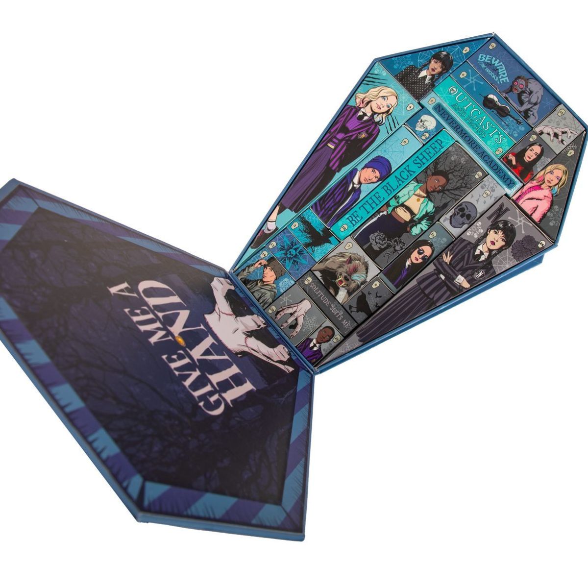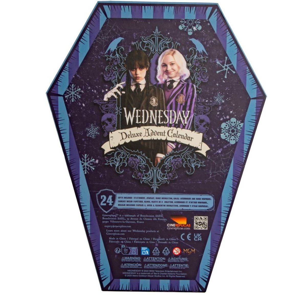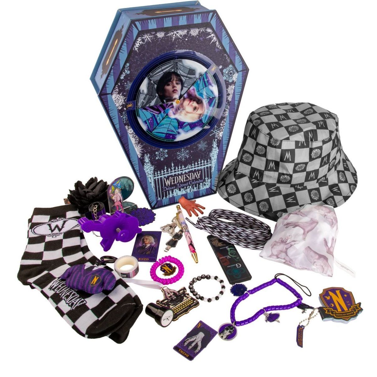 Kalendář přináší dávku každodenní zábavy, užitečných vychytávek a neodolatelného Wednesday stylu – ideální pro ty, kteří se nebojí trochu temné elegance.
