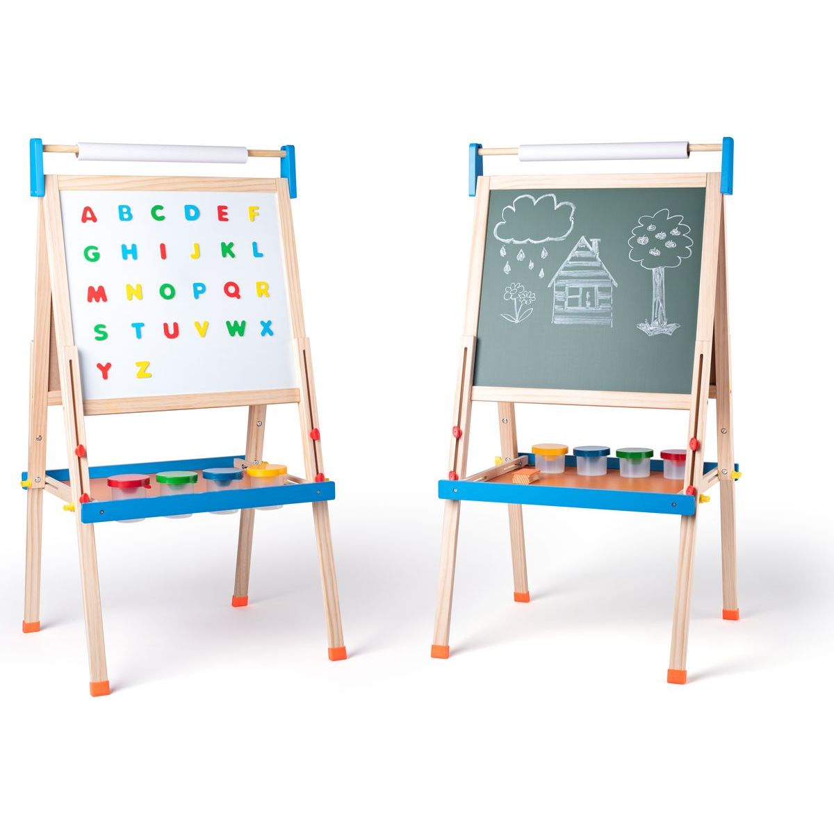 Oboustranná tabule na dřevěné rozkládací konstrukci, nabízí dětem plochu pro kreativní činnost. Na magnetické ploše se mohou seznamovat s písmeny a sestavovat je do jednoduchých slov. Na druhé straně si mohou z horní části tabul natáhnout papír a malovat s barvami v přiložených kelímcích. Pokud na tabuli nebude papír mohou psát křídami na zelenou plochu.