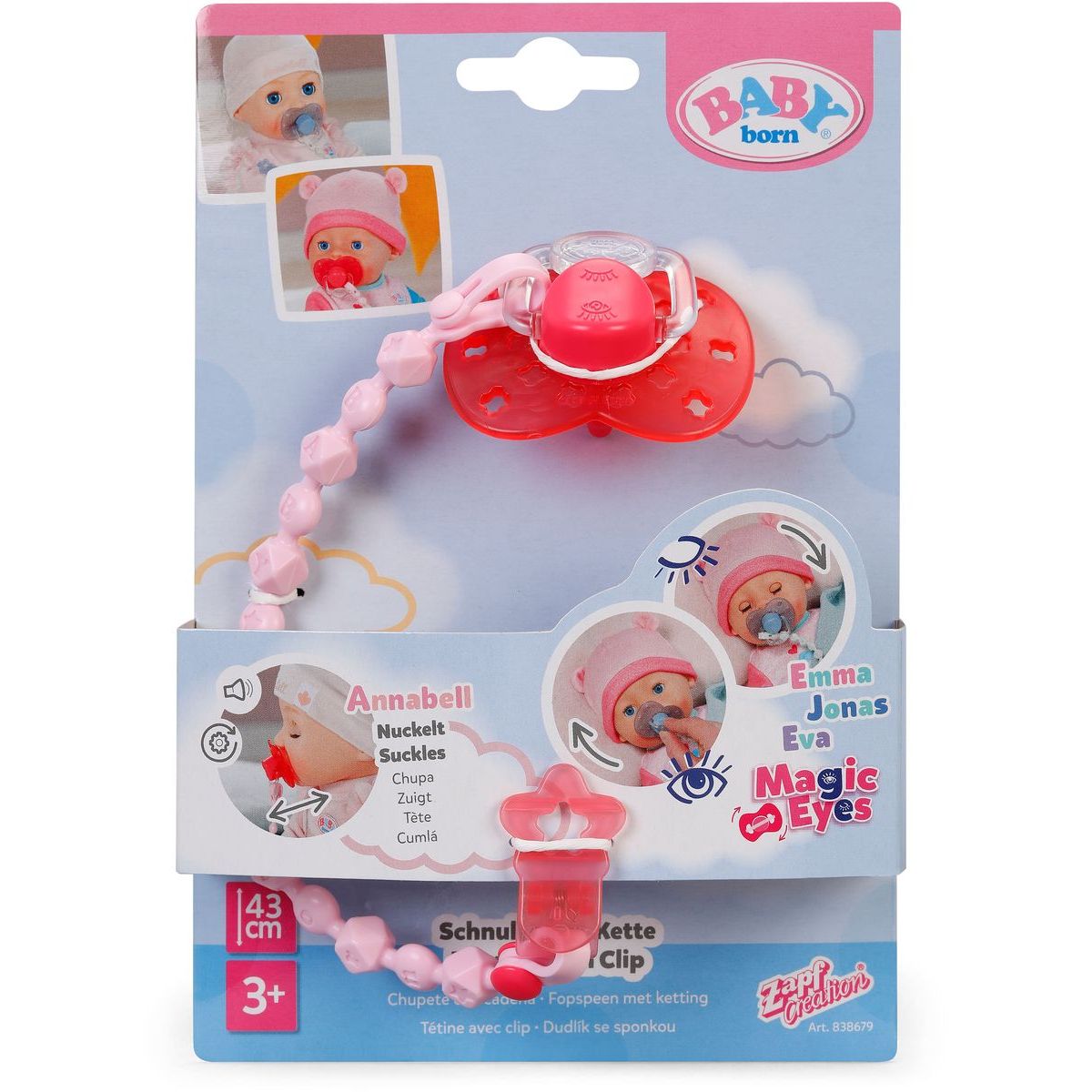 Dudlík aktivuje speciální reakce u panenek velikosti 43 cm – Annabell a Alexander ho sají, zatímco Emma, Eva a Jonas zavírají oči při jeho otočení.