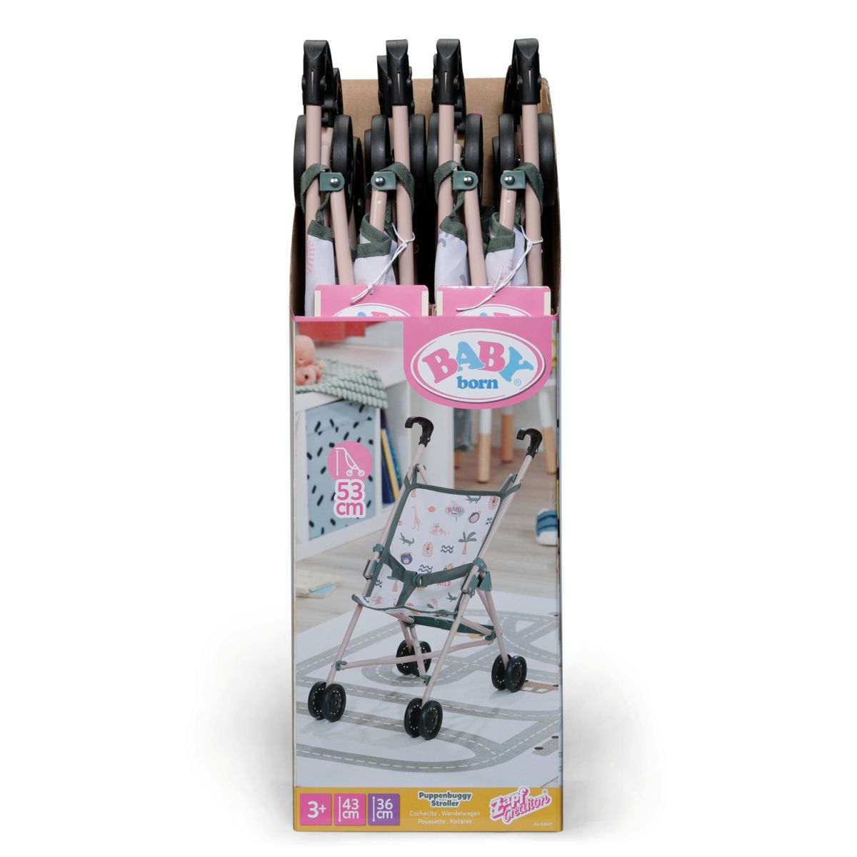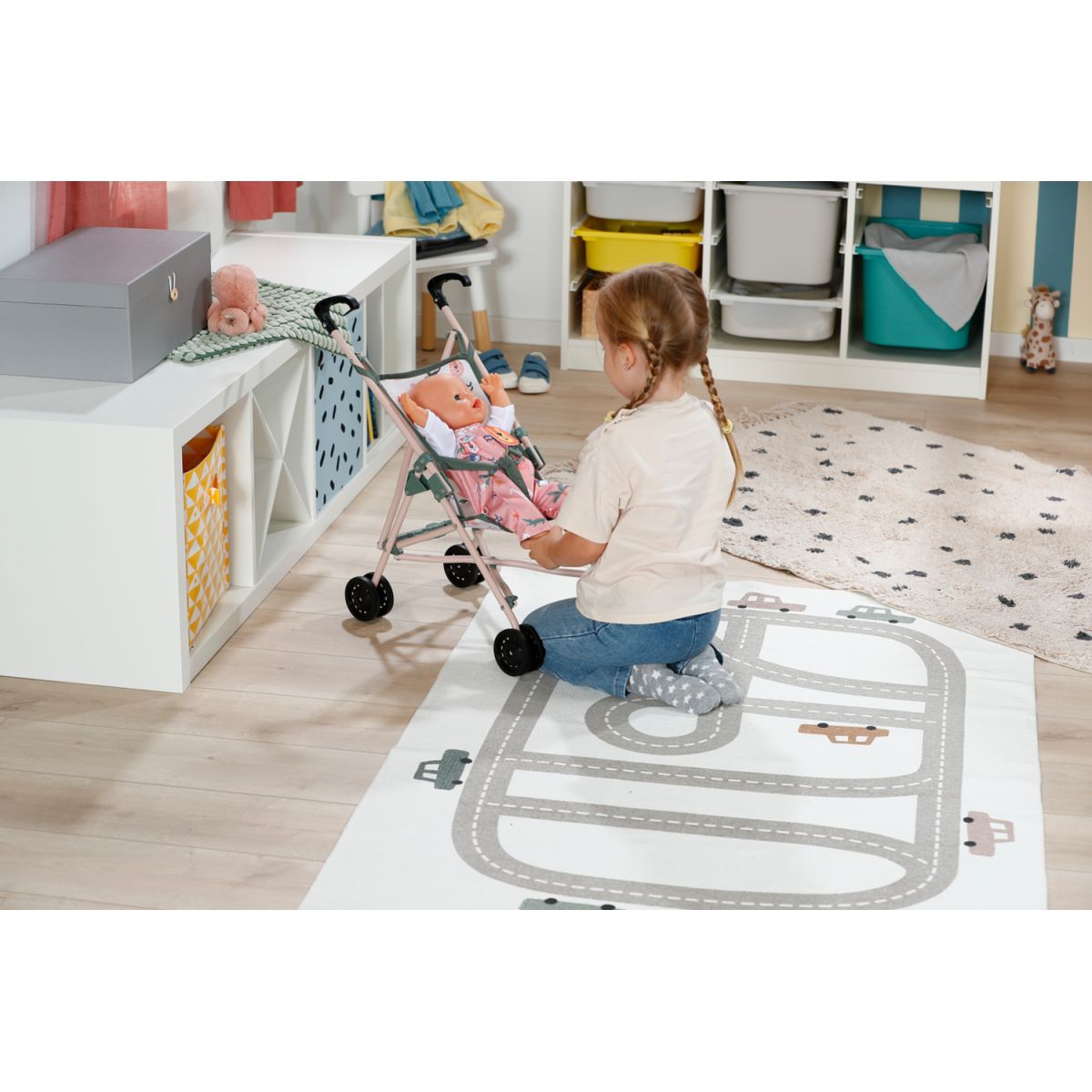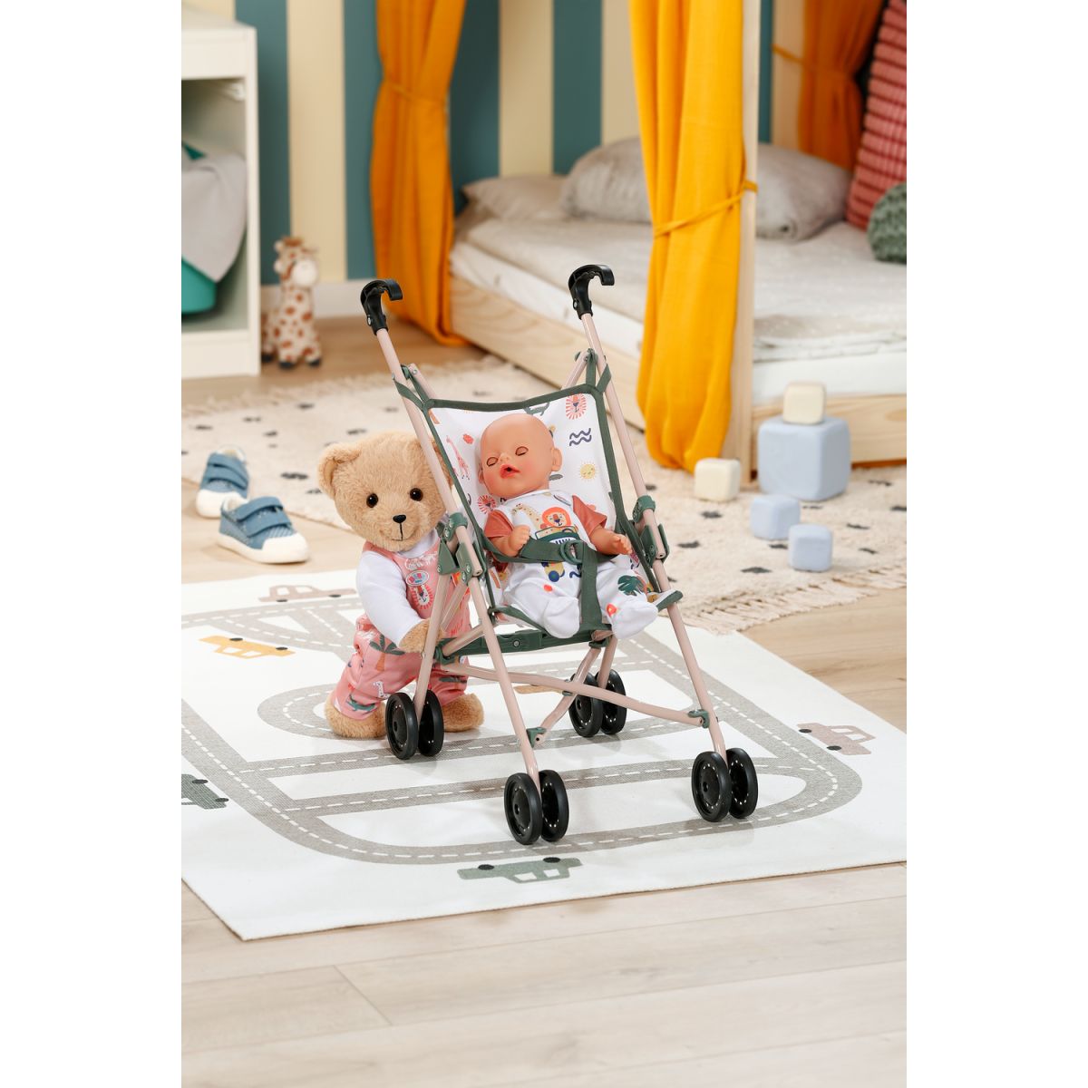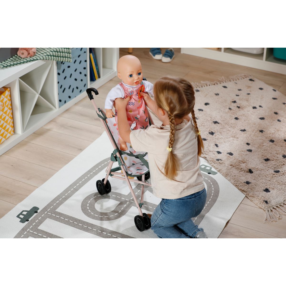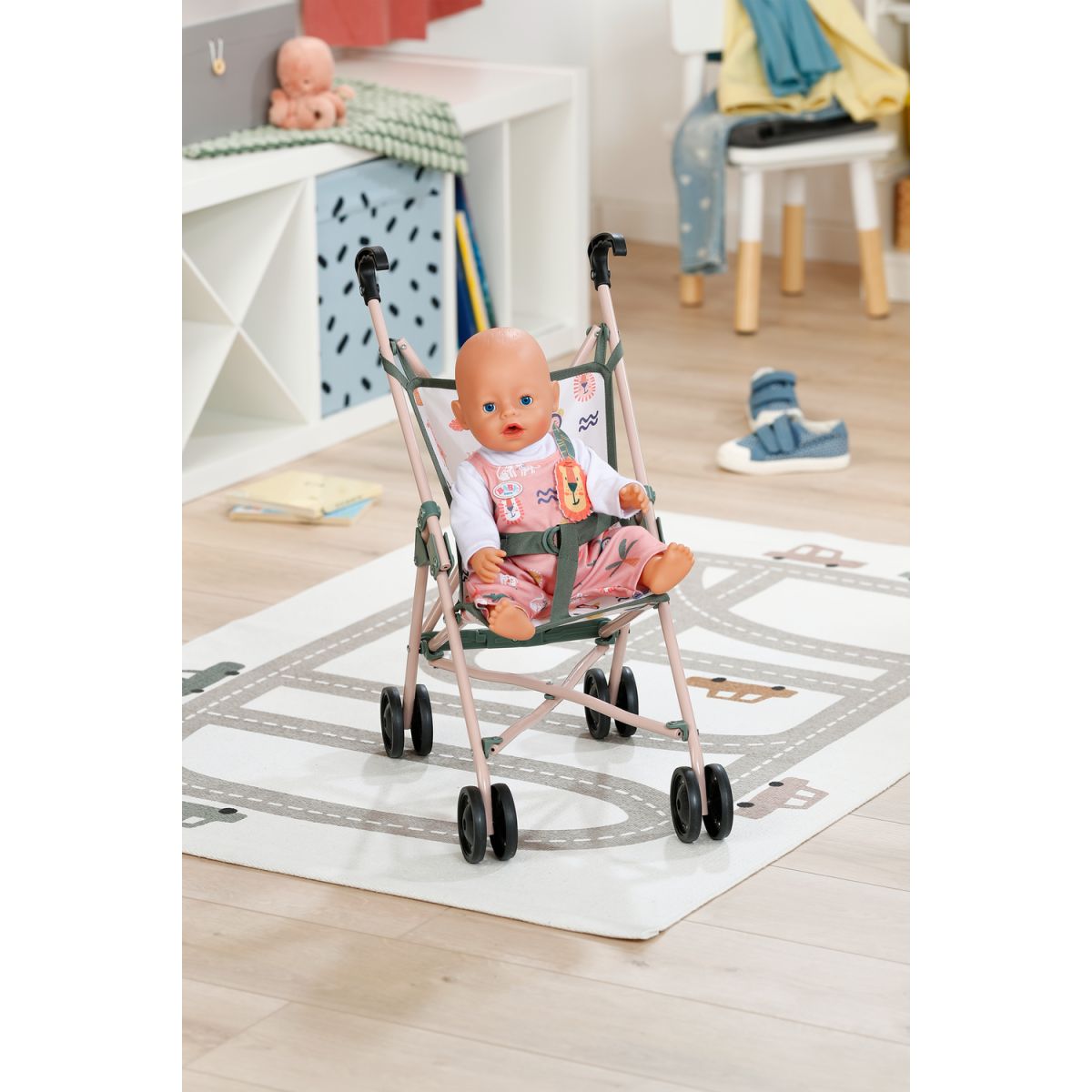 BABY born Kočárek hole je lehký a skladný parťák na každou procházku. Díky bezpečnostním pásům panenka vždy sedí pevně a může si užívat pohodlnou jízdu. S madlem ve výšce 53 cm je kočárek ideální volbou pro menší děti, které si chtějí vyzkoušet péči o svou panenku.